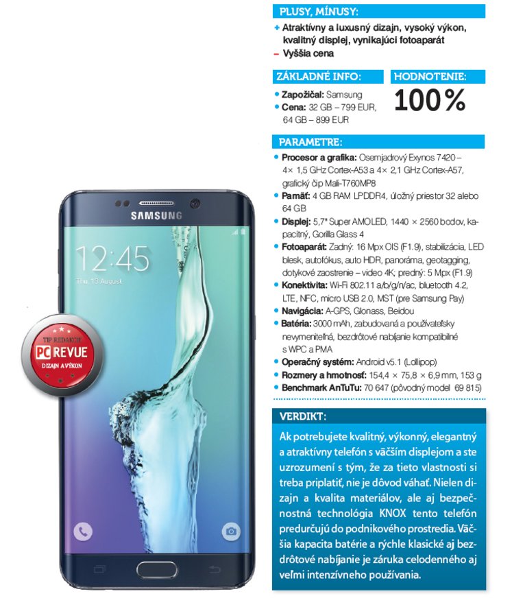 Telefón ako celok pôsobí robustne, napriek väčším rozmerom nemá tendenciu ohýbať sa či krútiť. Vďaka zaobleným hranám displeja sa telefón v ruke zdá subjektívne oveľa tenší, než v skutočnosti je. Napriek zadnej stene zo skla sa telefón nešmýka. Na tmavších farebných variantoch je to síce lapač odtlačkov prstov, no komu by to prekážalo, môže použiť vhodné puzdro. Keď už spomíname odtlačky prstov, snímač integrovaný vo veľkoplošnom tlačidle pod displejom vám zabezpečí vysokú bezpečnosť bez nutnosti prihlasovania sa pomocou pinu či inými metódami, ktoré viac alebo menej zdržujú. Keďže na dobré veci sa ľahko zvyká, žiarivé farby na displeji vám budú pripadať samozrejmé a bežné displeje notebookov a tabletov budú v porovnaní s S6 pôsobiť nevýrazne. Nielen displej, ale aj zvuk je vynikajúci, pod rovnomerné podanie všetkých frekvenčných pásiem vrátane stredov a vyšších basov sa podpísal väčší objem tela telefónu, a teda väčší priestor na ozvučnicu. Displej so zaoblenými rohmi má svoje špecifiká a atraktívny dizajn je pri niektorých dokumentoch a webových stránkach, kde sa text začína presne na okraji, vykúpený mierne obťažnejšou čitateľnosťou. Niekedy môže byť problém obsiahnuť ovládacie prvky na väčšom displeji pri ovládaní jednou rukou. Môžete si však nastaviť možnosť zmenšiť okno s ovládacími prvkami a pripnúť ho k pravému alebo ľavému dolnému okraju obrazovky podľa toho, či ste ľavák alebo pravák. Na aktivovanie stačí trikrát zatlačiť tlačidlo Home.