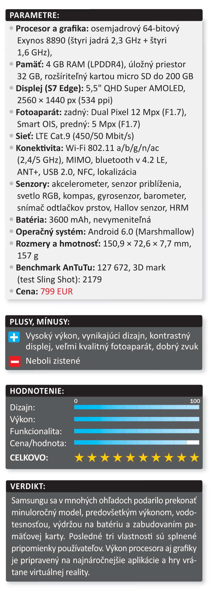 O výraznom náraste výpočtového a grafického výkonu najlepšie svedčí trojica hodnôt 69 815, 70 647 a 127 672. To sú skóre modelov Galaxy S6 Edge, S6 Edge + a S7 Edge v populárnom benchmarku AnTuTu. Namerané hodnoty v plnom rozsahu potvrdzujú tvrdenie Samsungu, že procesor nového modelu Galaxy S7 má o 30,4 % vyšší výkon, ako mal S6, a grafický čip je výkonnejší dokonca až o 63,9 %. Vyšší výkon si zákonite vyžaduje účinnejšie chladenie. Chladiaci systém S7 využíva podobný princíp ako chladničky či klimatizácie, teda vyparovanie a kondenzáciu. Tekutina v uzavretej tvarovanej chladiacej trubici sa pri zahriatí bude vyparovať a ochladí tak tepelne exponované miesta. Pri ochladzovaní v inej časti telefónu, kde nie sú polovodičové prvky, dochádza ku kondenzácii, takže teplo sa v telefóne rovnomerne rozloží a následne odovzdá do okolia. Ani počas behu benchmarkov, ani pri hraní náročných hier sme nezaznamenali sklon k prehrievaniu. V najteplejšom mieste sme namerali 39,6 stupňa a v spodnej najchladnejšej časti 30,2 stupňa. Ak sme počas hrania telefón zároveň nabíjali, teplota sa vyšplhala na 41,8 stupňa.