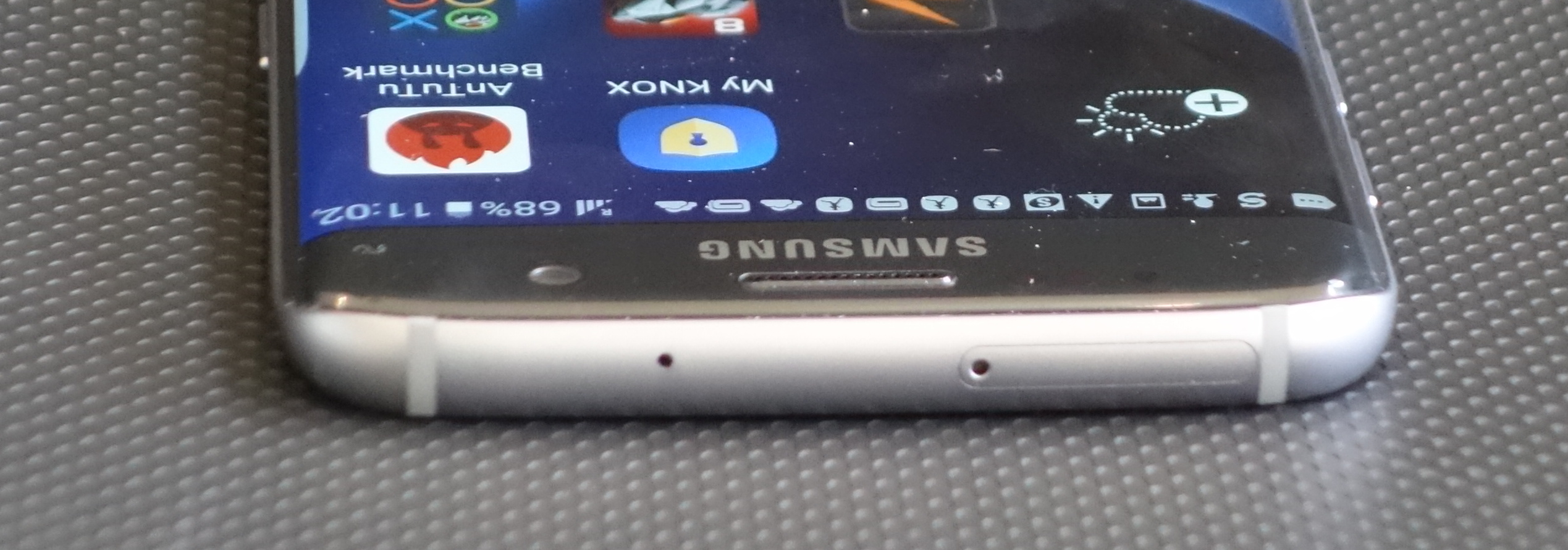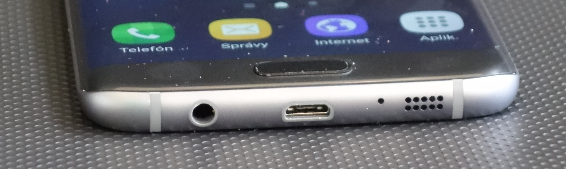 Hardvérové tlačidlo pod displejom s integrovaným snímačom odtlačku prsta je v porovnaní s S6 trochu väčšie a jeho tenučký rámik už nie je strieborne metalický, ale vo farbe zariadenia, teda v našom prípade čierny. Drobná, no pozitívna zmena smerom k dizajnovému minimalizmu. Presnosť identifikácie podľa odtlačku je takmer stopercentná. Exkurziu po obvode rámu začneme v hornej časti slotom na kartu SIM a microSD, nasleduje otvor na mikrofón kompenzujúci hluk pri telefonovaní. Na pravej strane sú dve oddelené tlačidlá na ovládanie hlasitosti. Dajú sa využiť aj na iný účel, napríklad ako spúšť fotoaparátu či na ovládanie zoomu. Najviac prvkov nájdete na dolnej hrane. Zľava doprava je to konektor na slúchadlá, konektor USB, otvor mikrofónu a mriežka z desiatich otvorov v dvoch radoch, pod ktorou je monofónny reproduktor. Na pravej strane rámu je len jediné tlačidlo na zapnutie/vypnutie.