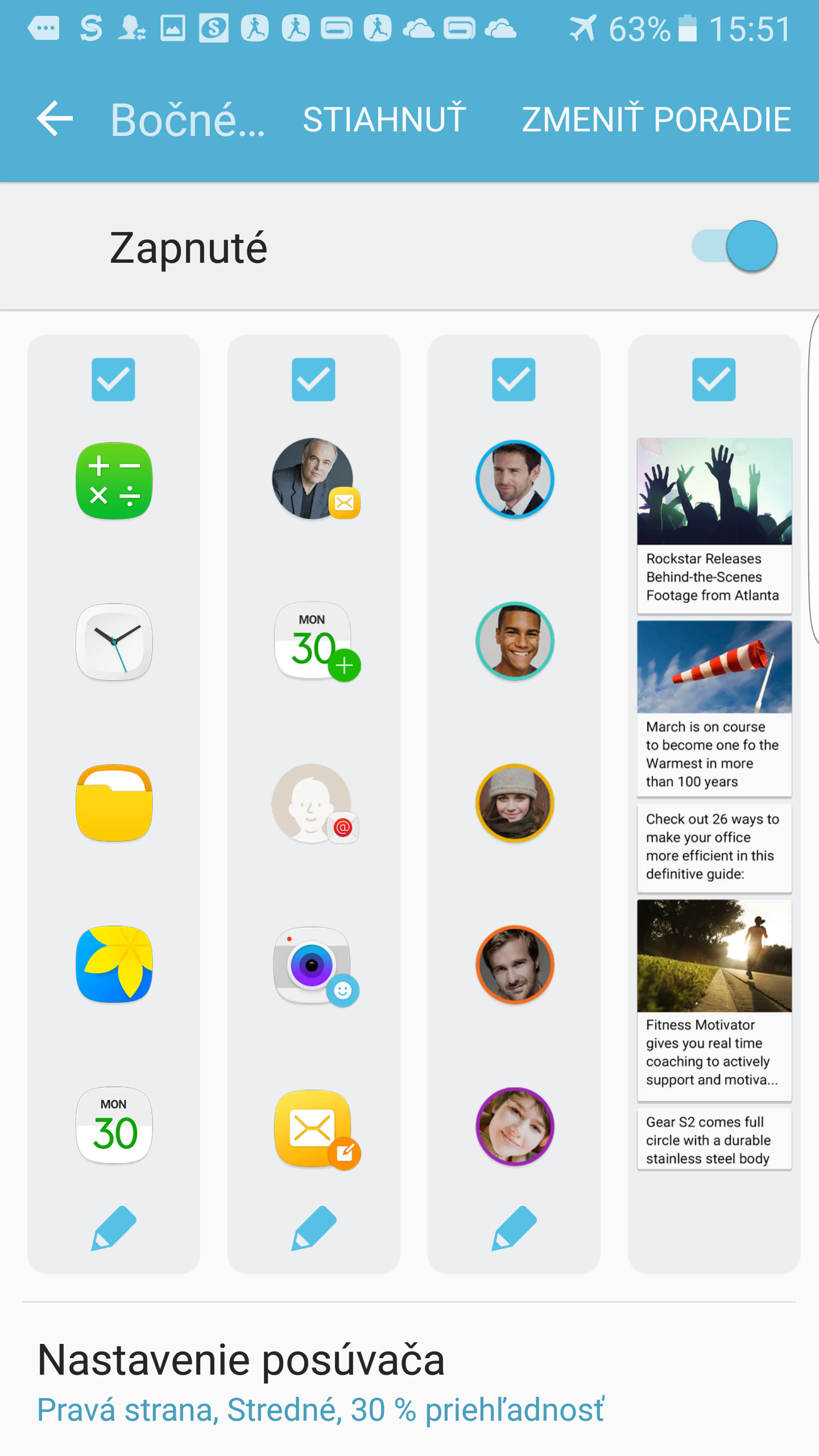 Android vo verzii 6.0 Marshmallow je doplnený nadstavbou TouchWiz, ktorú hodnotíme ako rozumné optimum medzi natívnym Androidom, tak ako ho poznáme z Nexusov, a prešperkovanými nadstavbami niektorých výrobcov, skrátka a dobre, zlatá stredná cesta. Používatelia modelu Edge ocenia bočný displej, ktorý zobrazíte gestom – pohybom prsta po zaoblenej časti displeja v mieste naznačenej zosvetlenou záložkou. Takto rýchlo vyvoláte obľúbený obsah, ktorým môžu byť napríklad často používané ikony, aktuálne spravodajstvo, kontakty alebo čokoľvek iné. Od budúceho mesiaca Samsung sprístupní SDK pre výrobcov softvéru. Predpokladáme, že začnú pribúdať rôzne varianty panelov „edge“ v aplikáciách tretích strán.