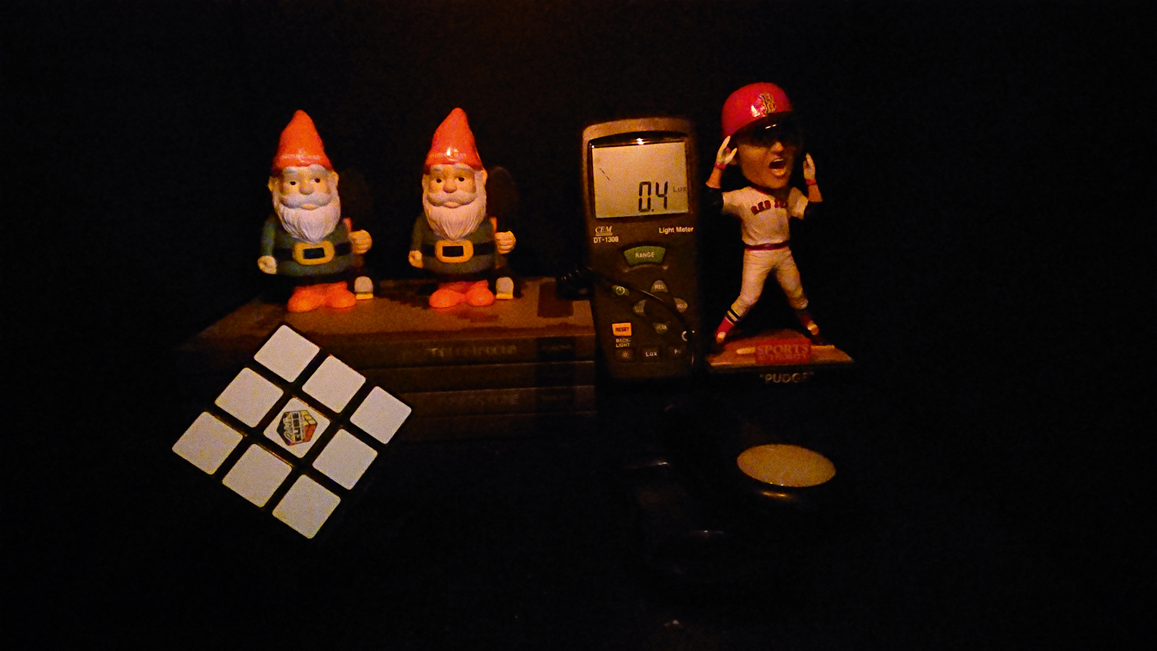 Pri hodnote osvetlenia 1 lux, čo je skutočne veľmi málo svetla, si všetky tri smartfóny počínali pomerne dobre. Najlepší výsledok, čo sa týka minima šumu a detailov vykreslenia obrazu, dosiahol Huawei P20 Pro. Sony Xperia XZ2 zvolila podľa môjho názoru zbytočne vysoké ISO, čo sa prejavilo na šume. Paradoxne ešte vyššie ISO deklaruje P20, ťažko povedať, čo hodnota 51 200 znamená v praxi, každopádne na šume sa to nijako neprejavilo. Potom som znížil hodnotu osvetlenia na polovicu, teda na 0,5 lx. Parametre expozícií sa nezmenili, jedine Huawei P20 deklaruje hodnotu 65 535. Z tejto hodnoty, ktorá nie je náhodná, pretože v hexadecimálnom vyjadrení znamená 0xFFFF, je zrejmé, že aplikácia fotoaparátu do 4 bajtov v EXIF nedokáže aktuálnu hodnotu zapísať. Napriek tomu Huawei P20 s prehľadom víťazí, obrázok je dobre prekreslený, hoci červená farba už vyzerá dosť „vyšedivená“. S9+ sa drží veľmi dobre, aj keď šumu pribúda. Xperia XZ2 má najviac šumu, no zároveň má pri tejto hodnote osvetlenia najlepšie podanie farieb.