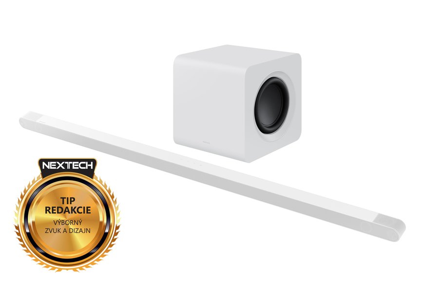 Samsung ponúka viacero radov lifestylových televízorov. Ak si takýto televízor chcete nainštalovať do moderného bytu, budete vyžadovať, aby aj soundbar zodpovedal dizajnovej línii a nebol veľmi nápadný. Práve tieto požiadavky sa snaží splniť nový ultratenký soundbar HW-S801B. Jeho nápaditý dizajn je veľmi vhodný, aj pokiaľ máte televízor zavesený na stene, o to viac, že aj so subwooferom je v bielej farbe. Napriek malým rozmerom zariadenie podporuje zvuk vo formátoch Dolby Atmos a DTS Virtual :X v konfigurácii 3.1.2, teda tri predné kanály, jeden subwoofer a dva predné horné kanály. Súprava sa skladá zo soundbaru a bezdrôtového subwoofera. HW-S801B je prvý soundbar na svete s bezdrôtovým prenosom priestorových formátov Dolby Atmos a DTS Virtual :X. Táto funkcia však pracuje iba s vybranými modelmi televízorov Samsung na rok 2022. Soundbar podporuje technológiu Q Symphony zabezpečujúcu spoluprácu s reproduktormi televízora, ktoré sú zapojené do ďalších virtuálnych kanálov. K zostave možno dokúpiť aj súpravu dvoch zadných bezdrôtových reproduktorov Wireless Rear Speaker Kit (SWA-9500S), ktoré doplnia pravý a ľavý zadný kanál a pravý a ľavý horný zadný kanál. Soundbar má tri možnosti pripojenia. Je tu dvojica portov micro HDMI na priebežné pripojenie externého zariadenia, napríklad satelitného prijímača, výstup podporuje eARC, takže si priestorový zvuk užijete aj pri prehrávaní streamovaného videa priamo na TV, napr. z Netflixu, YouTube a ďalších zdrojov. Vďaka technológii bluetooth môžete pripojiť mobilné zariadenia alebo PC, prípadne sa môžete spoľahnúť na Wi-Fi, ktoré zabezpečuje nielen bezdrôtový prenos priestorového zvuku, ale aj multiroomové pripojenie, takže s pomocou soundbaru môžete prehrávať hudbu napríklad zo služieb Spotify, Tidal alebo ďalších. Zariadenie má svoj diaľkový ovládač, môžete však využívať aj ovládač od TV. V prípade potreby sú ovládacie tlačidlá umiestnené na vrchnej strane soundbaru. Zariadenie nemá displej, iba rad LED diód, ktoré signalizujú stav, detekcia vstupov je hlasová.