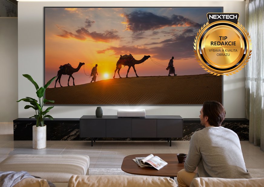 Projektor je navrhnutý s objektívom Ultra Short Throw, teda s premietaním na ultrakrátku vzdialenosť. V praxi to znamená, že na dosiahnutie uhlopriečky 100 – 130" je umiestnený v rozsahu 113 – 238 mm od plátna. To je dôležité práve v role domáceho projektora, pretože je umiestnený priamo pod plátnom a nemusíte mu hľadať špeciálne miesto ako pri klasických projektoroch. Zariadenie má navyše aj pekný minimalistický dizajn, takže bez problémov zapadne a na prvý pohľad vyzerá skôr ako malý soundbar. Predná strana je potiahnutá tkaninou a ukrýva zvukový systém s podporou 4.2 kanálov, telo je z bieleho lesklého plastu. Systém s optikou je umiestnený na vrchnej strane. Projektor využíva technológiu DLP s výkonným trojitým laserom, ktorý poskytne svietivosť 2800 ANSI lúmenov. To zabezpečuje možnosť výborne vykresľovať obsah s vysokým dynamickým rozsahom. Projektor je jeden z prvých s certifikáciou HDR10+. Vďaka systému troch laserov zvláda impozantný farebný rozsah s gamutom až 106 % rozsahu BT.2020. Na to si zatiaľ nesiahne ani žiadny z televízorov. Technológia laserových projektorov bola ešte donedávna výsadou iba profesionálnych modelov a okrem vysokej svietivosti ponúka predovšetkým dlhú životnosť laserových svetelných zdrojov, a to až 20 000 hodín. Táto hodnota nie je prehnaná, laserové projektory sa v profesionálnej sfére používajú pomerne dlho a zväčša pracujú v režime 24/7, takže nároky na ne sú podstatne vyššie ako pri domácich zariadeniach. So životnosťou svetelných zdrojov si tak určite nemusíte robiť starosti a projektor rozhodne skôr zastará morálne, než by došlo k ich degradácii. Chladenie zabezpečuje ventilátor, ktorý produkuje minimálny hluk a pri bežnom sledovaní ho nemáte šancu počuť. Projekcia je realizovaná na plátno, ktoré nie je súčasťou dodávky. Nepovažujem to za problém, pretože si môžete zvoliť umiestnenie pred alebo za plátnom, prípadne na strope, a teda plátno môže byť rôzne. Projektor vyžaduje pomerne presnú kalibráciu na plátno, a preto odporúčam zveriť to profesionálom, ak s takýmito vecami nemáte skúsenosti. Vzhľadom na to, že ide o laserový projektor, stretávam sa občas s otázkou bezpečnosti. Tu treba povedať, že zariadenie má systém, ktorý automaticky zníži jas pri priblížení napríklad dieťaťa. Ten treba v prípade, že máte deti, aktivovať alebo zvoliť umiestnenie na strope. Pri bežnom používaní však nič nehrozí. Vzhľadom na svietivosť nejde o nebezpečný zdroj a ultrakrátky objektív svetlo účinne rozptyľuje, takže ani pri priamom osvietení nehrozí poškodenie zraku. Navyše vzhľadom na konštrukciu zariadenia musíte vyvinúť pomerne veľkú snahu, aby ste sa pozerali priamo do objektívu.