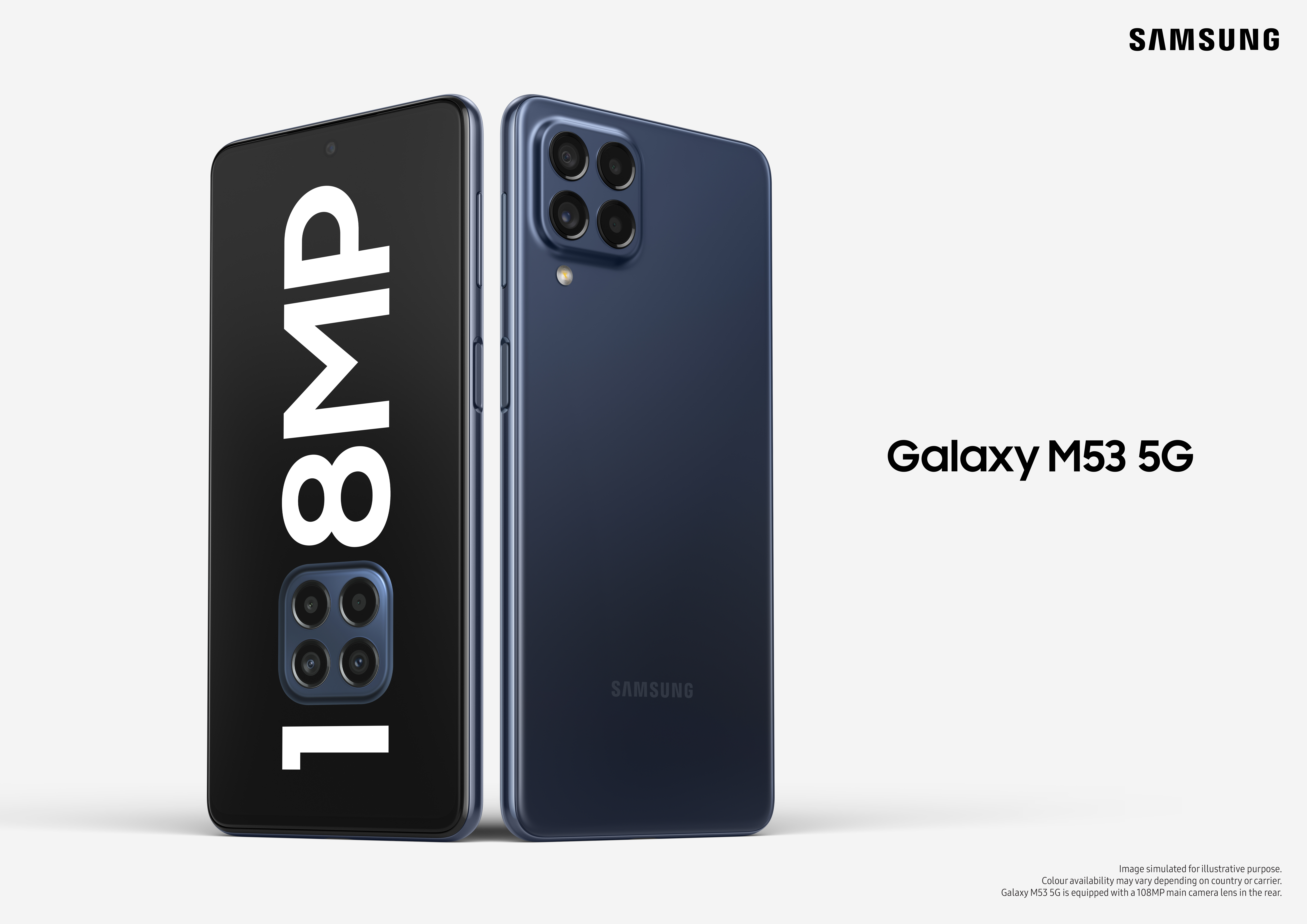 Spoločnosť Samsung Electronics predstavila nový smartfón, ktorý rozširuje sériu Galaxy M a maximalizuje užívateľský zážitok – Galaxy M53 5G. Novinka sa môže pochváliť výkonným procesorom, displejom FHD+ sAMOLED+ Infinity-O so 120 Hz obnovovacou frekvenciou a uhlopriečkou 6,7", 5000 mAh batériou alebo fotoaparátom s vysokým rozlíšením až 108 Mpix. Samsung Galaxy M53 5G bude na Slovensku dostupný od 29. apríla 2022 vo variante 8+128 GB v modrej, hnedej a zelenej farbe a jeho odporúčaná maloobchodná cena je 519 €.