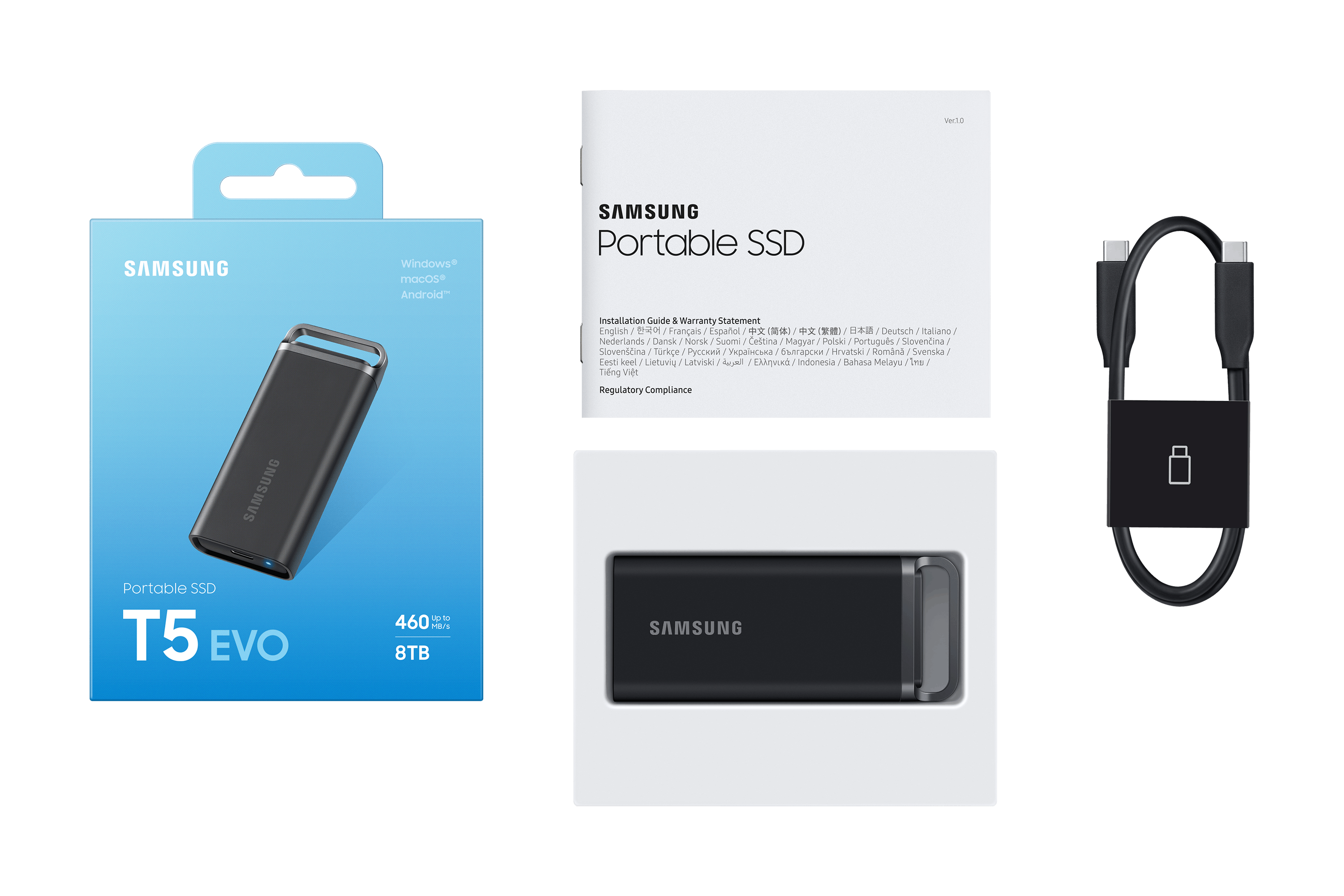 Spoločnosť Samsung Electronics, svetová jednotka v odbore pokročilých polovodičových technológií, dnes predstavila T5 EVO, malý a ľahký SSD disk s kapacitou až 8 terabajtov (TB). Viac úložného priestoru žiadny prenosný SSD disk na súčasnom trhu neponúka. Okrem kapacity patrí medzi hlavné prednosti T5 EVO bleskurýchly dátový prenos a kompaktné odolné prevedenie.
