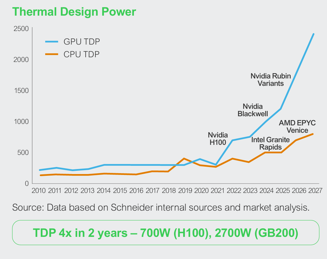 Hlavne s nástupom AI sa posúva hustota výkonu 140 kW na rack a vytvára predpoklady pre budúce hustoty výkonu 1 MW a viac, čipy umelej inteligencie sa zahrievajú a hustejšie sa zahrievajú. Dátové centrá vyžadujú kvapalinové chladenie na efektívne chladenie infraštruktúry. Chladenie môže spotrebovať až 40 % energetického rozpočtu dátového centra. Priame kvapalinové chladenie je až 3 000-krát efektívnejšie a účinnejšie pri odvádzaní tepla ako vzduch, pretože zachytáva teplo priamo na úrovni čipu. Nasadenie technológie kvapalinového chladenia je však zložité a vyžaduje si skutočne komplexný prístup, ktorý zohľadňuje získavanie a inštaláciu technológií a priebežnú údržbu. Riešenia sú vyvíjané v spolupráci so spoločnosťou NVIDIA a ďalšími poprednými výrobcami grafických procesorov.