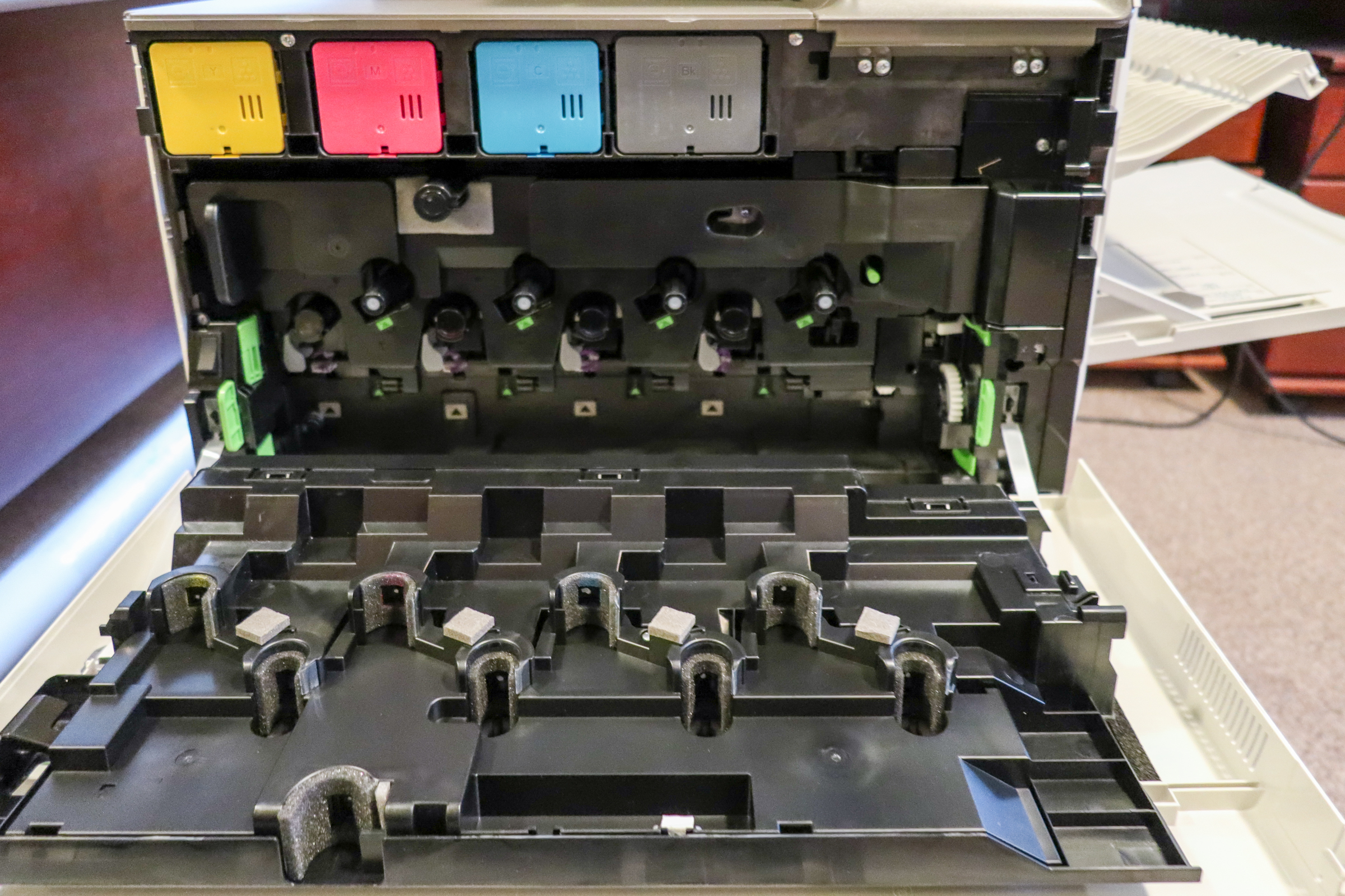 Testovanie potvrdilo výrobcom udávané parametre rýchlosti tlače aj kopírovania. Pri posudzovaní kvality výtlačkov som sa zameral na predpokladané scenáre, teda na tlač dokumentov obsahujúcich farebnú grafiku na bežný kancelársky papier a tlač marketingových materiálov na hrubší lesklý papier. Vytlačil som obálku časopisu z digitálnej predlohy a potom som skopíroval tú istú obálku z už vytlačeného časopisu. Prekvapil ma minimálny rozdiel v kvalite medzi výtlačkom a kópiou a takisto prakticky zhodné podanie farebných odtieňov ako na výtlačku časopisu z polygrafickej firmy. Počas intenzívneho testovania sa mi ani raz nepodarilo dosiahnuť, aby sa pri tlači alebo kopírovaní zasekol papier, no keby k tomu aj došlo, prakticky celá vodiaca dráha papiera sa dá odkryť a problém hravo vyrieši každá sekretárka. Pri obojstrannom kopírovaní dokumentov som použil štandardný postup – zobral v ekonomickom oddelení hromádku dokumentov, veľa z nich bolo predtým zložených v obálkach, niektoré dokumenty boli na hrubšom papieri. Odstránil som sponky a spustil kopírovanie. Podávač nemal problém dokonca ani s dokumentom, ktorý bol pokrčený a znovu vystretý.