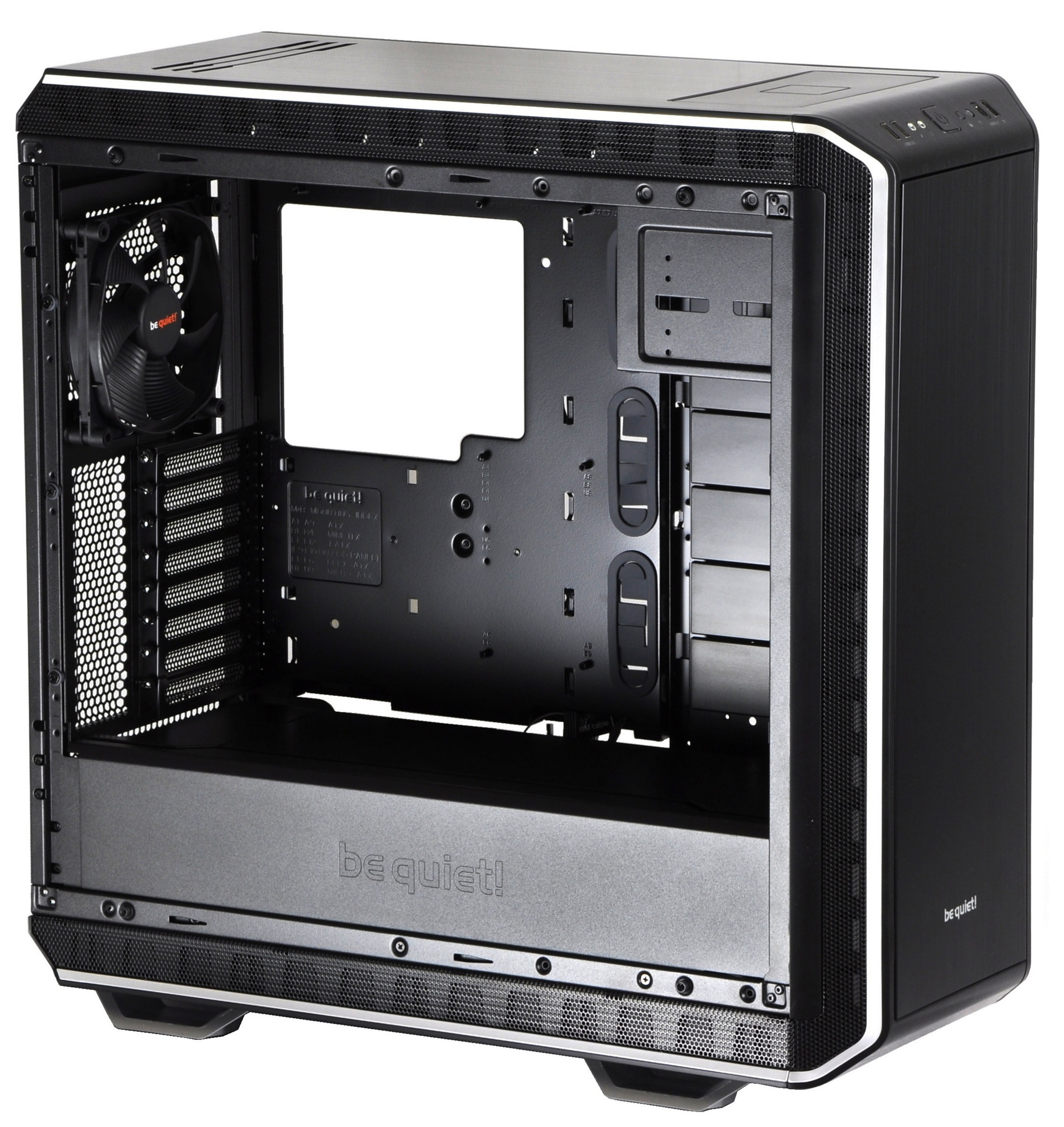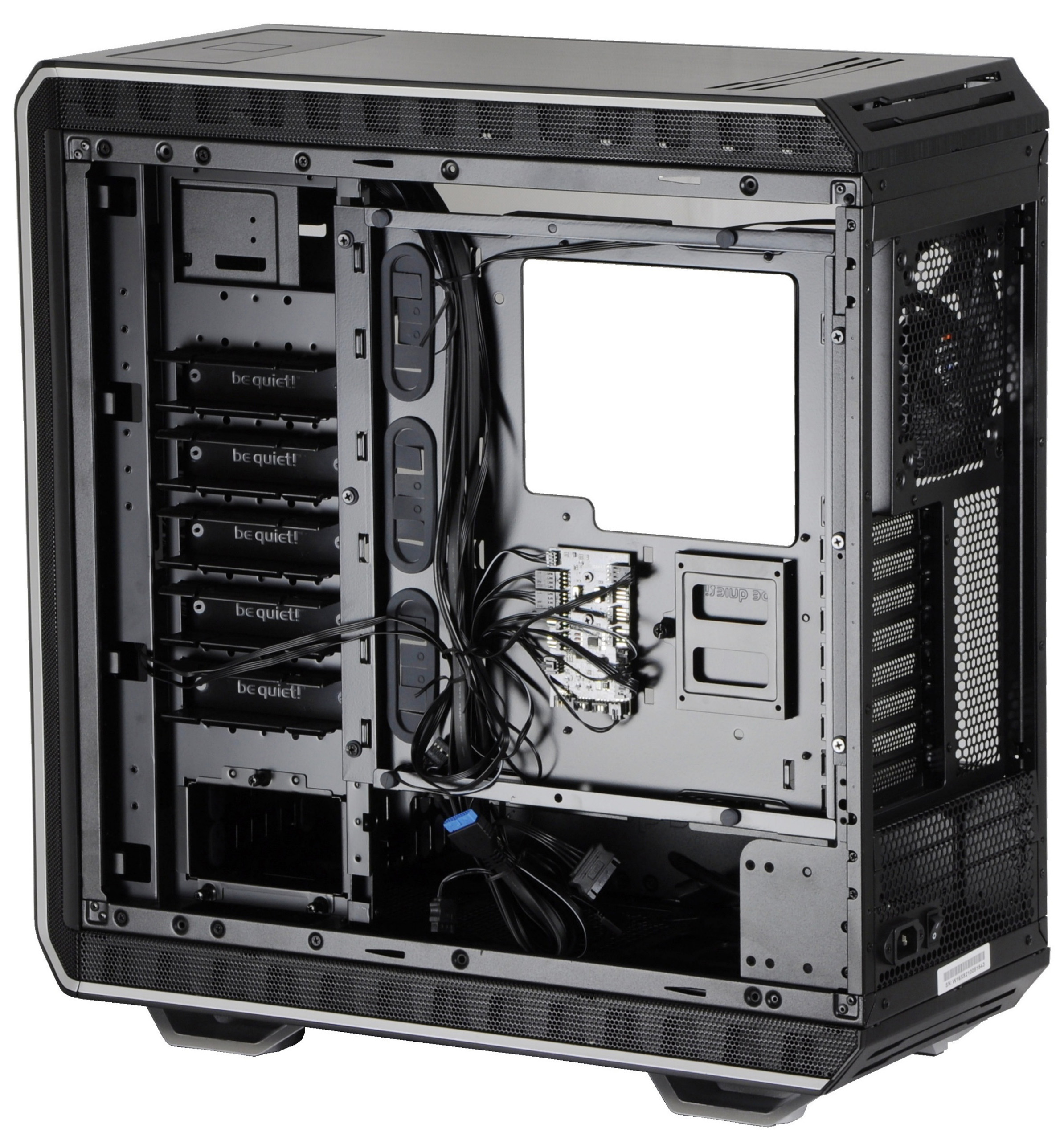 Pozoruhodné je pokročilé odvibrovanie na všetkých miestach s pohyblivými časťami. Na gumičkách je dokonca i podnos základnej dosky. Ten je znovu konvertibilný a v prípade, že chcete priezor cez temperované sklo z pravej strany, môžete si ho prehodiť na druhú stranu. Praktické je i výškové polohovanie základnej dosky, ktoré popúšťa uzdu hrubším radiátorom – z východiskových 40 mm teoreticky až na 105 mm. Pri naozaj hrubých radiátoroch je daňou za to odstrihnutie od spodných slotov PCIe. Okrem vysokej flexibility skrinku charakterizuje i precízne pokrytie odhlučňujúcou hmotou. Tá príde vhod napríklad na tlmenie zvuku mechaniky platňových diskov či vodného čerpadla. Mimochodom, podpora radiátorov je prakticky neobmedzene široká a dlhé 480 mm modely sa dajú nainštalovať dopredu i na strop súčasne. Ventilátory (tri 140 mm Silent Wings 3) sú to najlepšie, čo sa v hotových skrinkách dodáva.