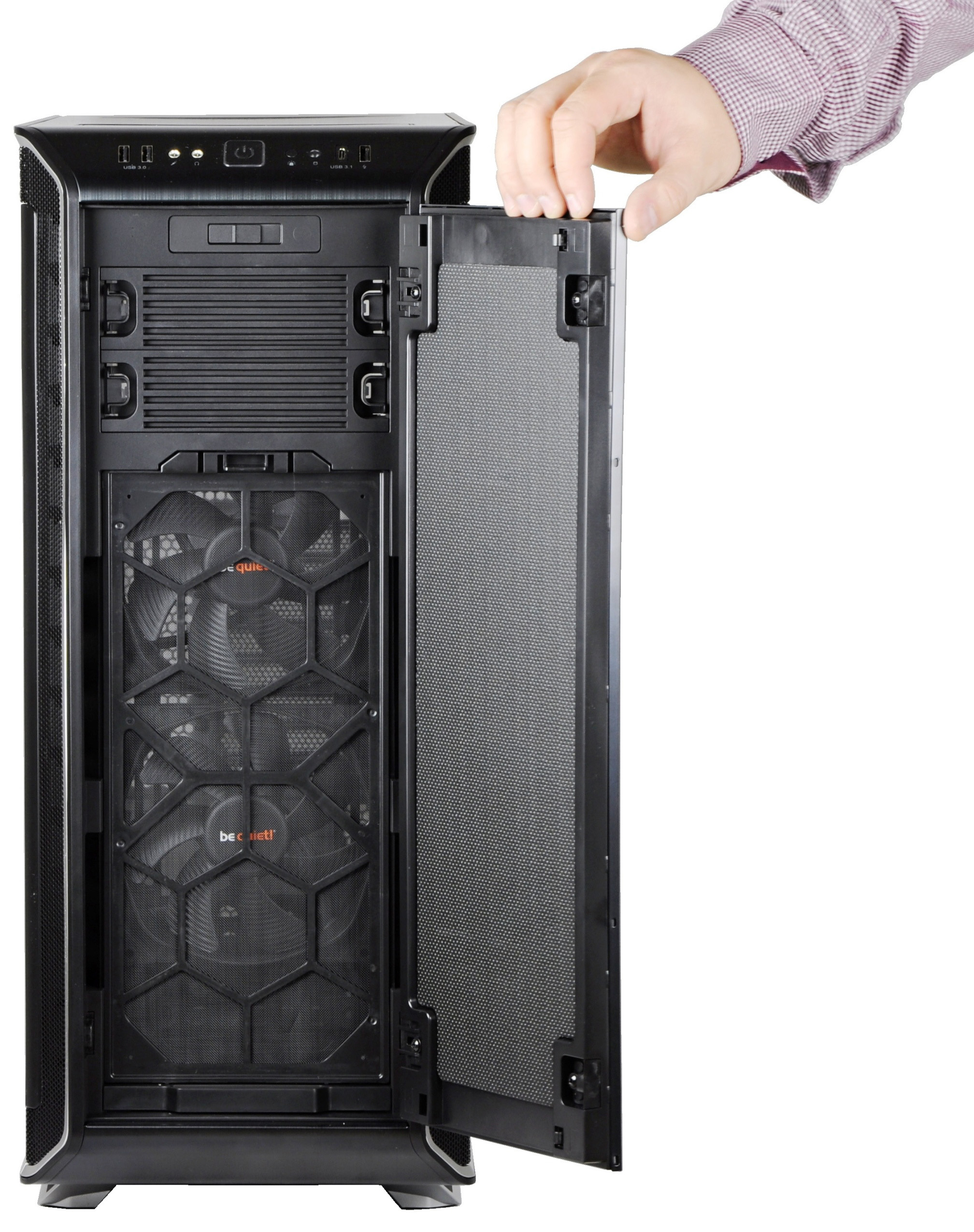 Menšiu výhradu mám k dvierkam so subtílnejšími pántmi, než by k zvyšku bolo adekvátne, a k štandardne nepohodlnému úchytu bočného skla cez matičky po rohoch. Tu by sa BeQuiet! mohol inšpirovať šikovným systémom z NZXT H500(i).