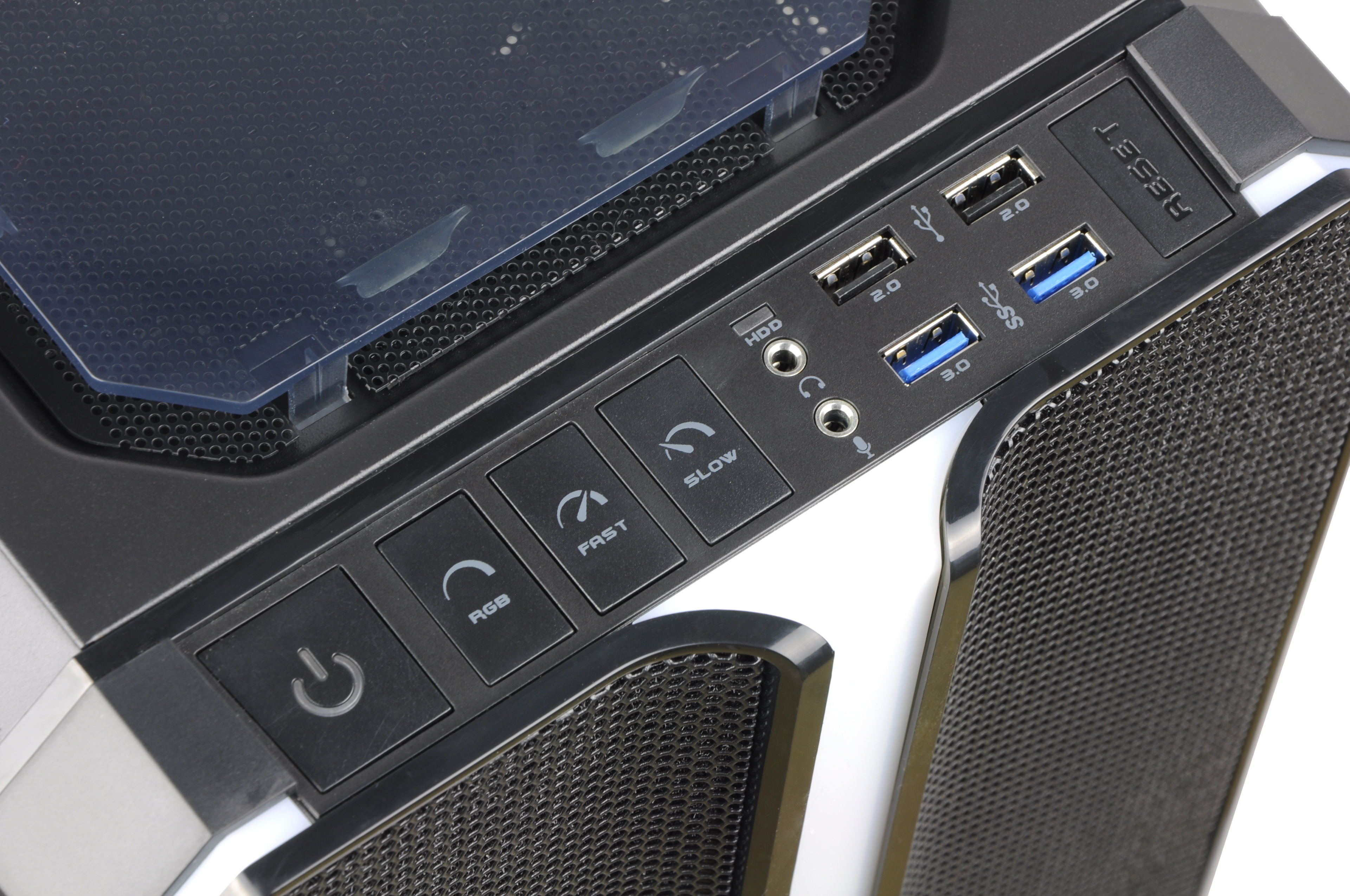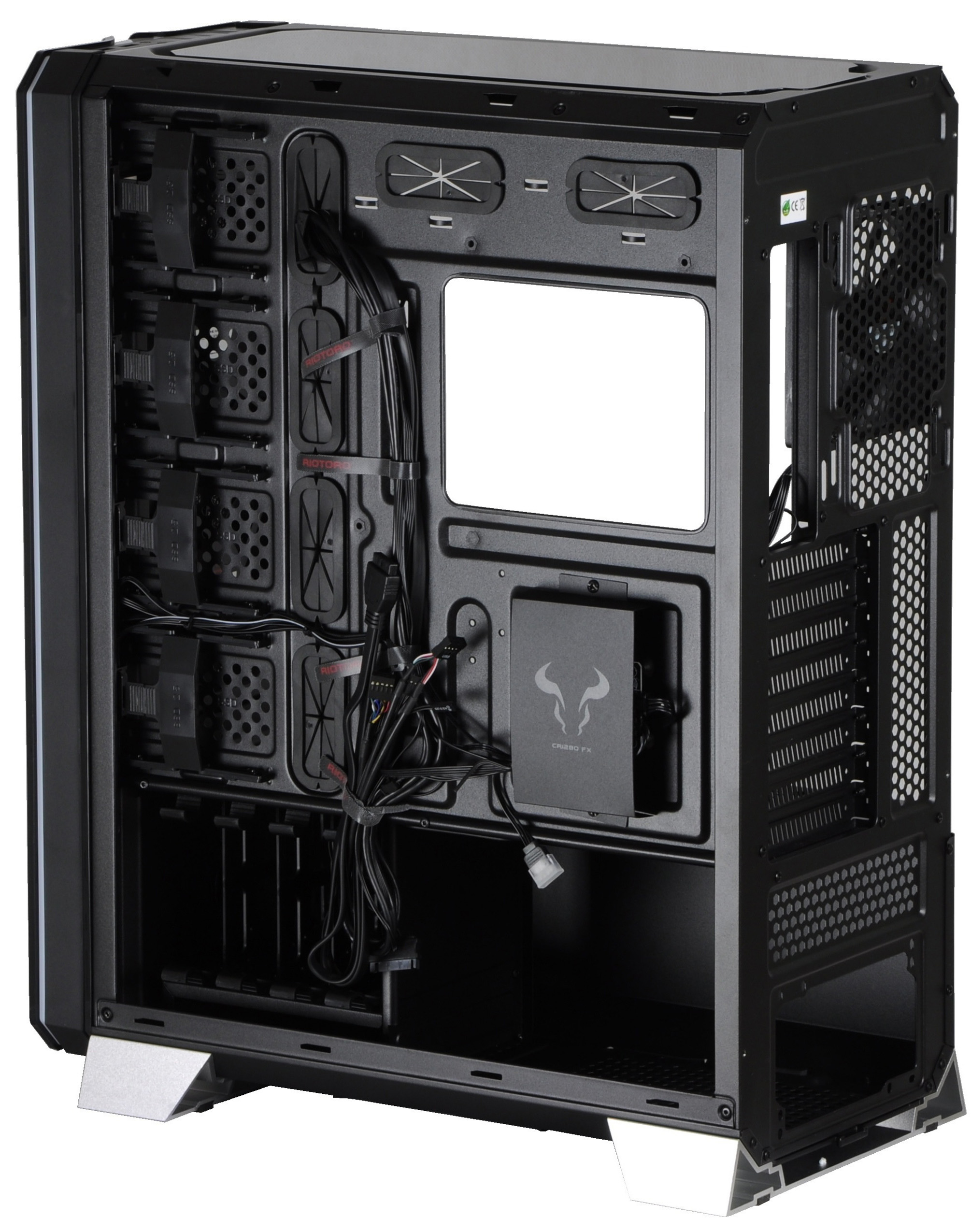 Zo „slabšieho“ materiálu sú i oceľové plechy, z ktorých pozostáva prakticky celý zvyšok konštrukcie. Majú rozdielne hrúbky od 0,65 po 0,85 mm, pričom nosné časti (vrátane podnosu základnej dosky) alebo bočnica sú hrubšie. Silnejšie sú i stojany na plastové vozíky HDD. Prvky proti šíreniu vibrácií tu však chýbajú, čo je škoda. Systémové ventilátory sa pripájajú na vstavaný rozbočovač, ktorý možno pohodlne nastaviť na veľmi tichý chod a v prípade potreby sa dá cirkulácia vzduchu popohnať susedným tlačidlom. Samostatný prepínač je i na ovládanie podsvietenia býčieho loga a dlhého svetlovodu, ktorý čelný panel po výške opticky rozdeľuje na dve polovice. Rozloženie svetla LED je rovnomerné a pôsobí dobre. No až tak reprezentatívne už nevyzerá predný nevyberateľný filter z tenkej peny. Prach sa dá odsať iba spredu cez perforáciu, ktorá je jednou z charakteristických čŕt vzhľadu. Filter na dne pod zdrojom je už v poriadku – vyberateľný, umývateľný a s jemným sitom.