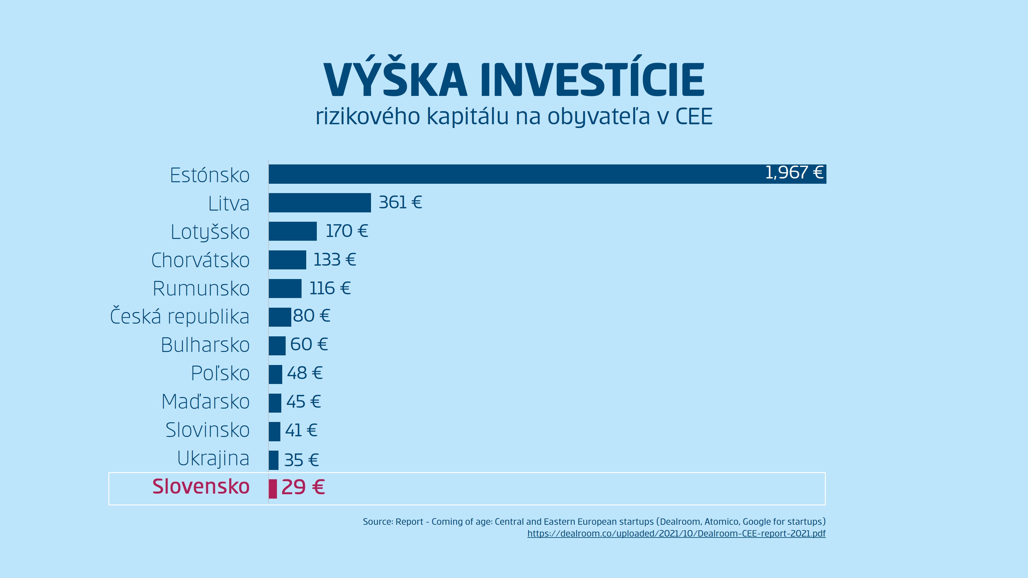 Necelých 30 eur versus takmer 2000 eur v prepočte na obyvateľa. Takýto priepastný rozdiel je medzi investíciami do startupov na Slovensku a svetovým lídrom – Estónskom. Viac ako my investujú do startupov dokonca aj Rumuni, Bulhari či Ukrajinci. Tradične sú na tom lepšie aj zvyšní naši susedia Česi, Maďari, Poliaci a Rakúšania.