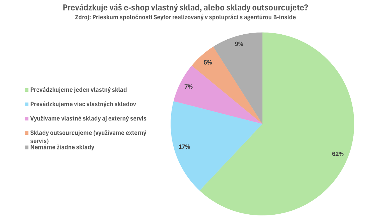 V oblasti logistiky prevažuje vlastná skladová infraštruktúra. Drvivá väčšina e-shopov prevádzkuje jeden vlastný sklad, väčšie prevádzky niekedy využívajú viac vlastných skladov. Len približne desatina e-shopov svoj sklad plne alebo čiastočne outsourcuje a bez skladov funguje 9 percent obchodov.