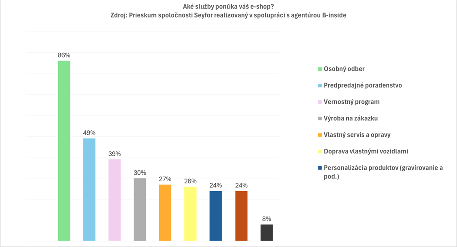 V ponuke doplnkových služieb je jasným štandardom osobný odber, ktorý zákazníkom ponúka 86 percent e-shopov. Ďalšie služby sú už podstatne menej rozšírené: predpredajné poradenstvo uvádza 49 percent, vernostný program 39 percent, výrobu na zákazku 30 percent, vlastný servis a opravy 27 percent a dopravu vlastnými vozidlami 26 percent. Personalizáciu produktov (napríklad potlač, gravírovanie alebo úpravy) a montáž či inštaláciu rovnako ponúka 24 percent obchodov. Priemerne prevádzkovatelia e-shopov ponúkajú tri z uvedených služieb.