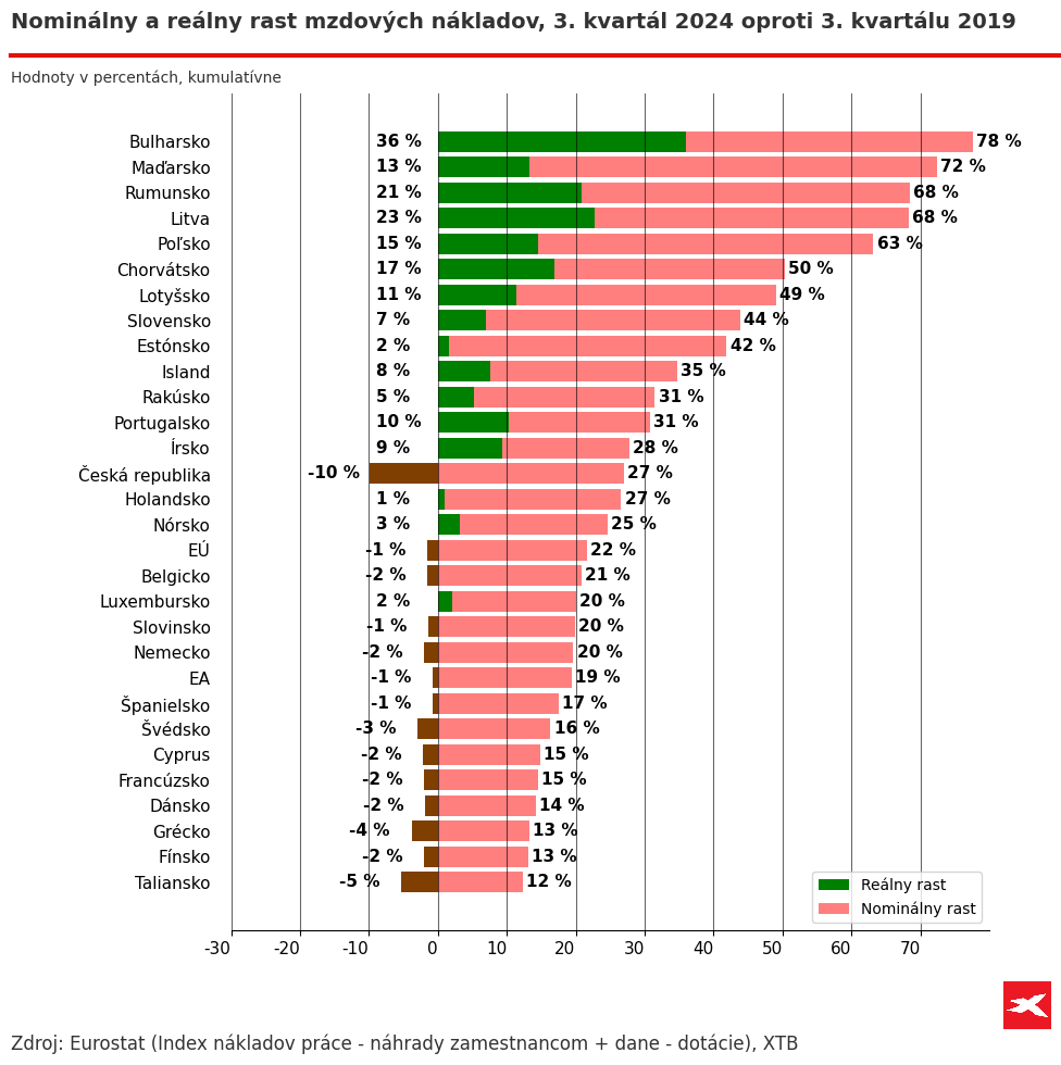Naopak, najvýraznejší prepad reálnych mzdových nákladov bol zaznamenaný v Česku, až o 10 percent. „Môže to byť skreslené zrušením superhrubej mzdy, čo viedlo k formálnemu zníženiu mzdových nákladov zamestnávateľov, hoci to neznamenalo priamy pokles čistých príjmov zamestnancov,” dodáva analytik. Napriek tomu aj dáta Českého štatistického úradu hovoria o nižších reálnych mzdách o približne päť percent. České mzdy však postupne smerujú na predkovidovú úroveň a mali by sa tam dostať za 12 až 16 mesiacov v závislosti od (ne)naplnenia rizík spomalenia európskej ekonomiky.