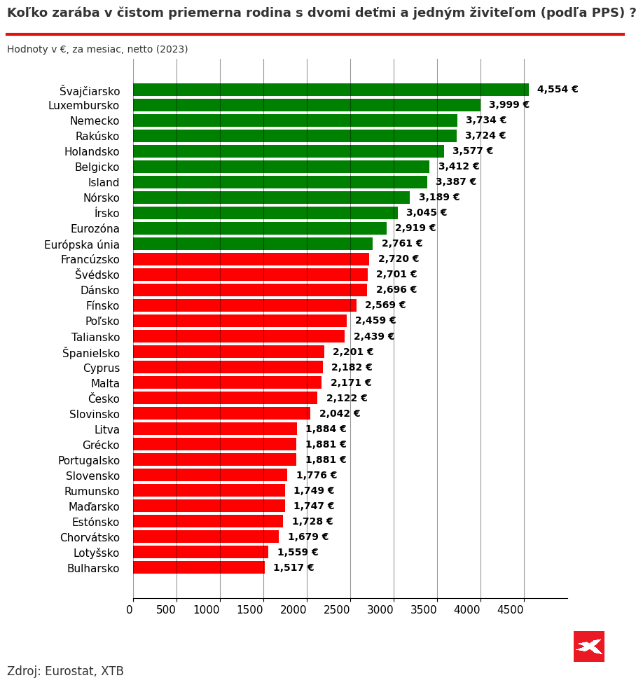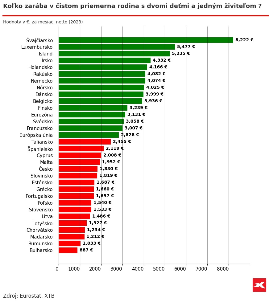 Slovensko síce poskytuje významnú podporu rodinám s deťmi, čo ovplyvňuje celkové príjmy domácností, no aj tak zostáva postavenie v európskom rebríčku pomerne nízke. V roku 2023 dosahoval priemerný čistý príjem rodiny s jedným živiteľom a dvoma deťmi 1 533 eur, čím sa Slovensko posunulo len o niečo vyššie – na siedme miesto od konca.