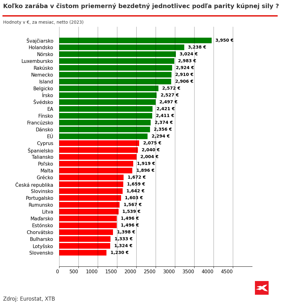 - Najhoršie sú na tom bezdetní Slováci, ktorí pri zohľadnení parity kúpnej sily zarábali najmenej v Európe, v priemere 1 230 eur mesačne. Na porovnanie, Švajčiari mali k dispozícii takmer 4 000 eur a priemer EÚ sa šplhal k 2 300 eurám.
