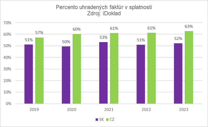 Percento disciplinovaných podnikateľov, ktorí uhrádzajú faktúry včas, je zhruba na tej istej úrovni. Kým v roku 2019 uhradilo do dátumu splatnosti faktúry 51 percent podnikateľov, tak v minulom roku to bolo 52 percent.