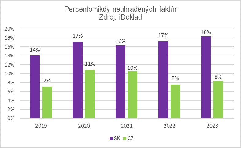 Platobná morálka českých podnikateľov sa zlepšuje. Na Slovensku je trend opačný. Zatiaľ čo v minulom roku zostalo v českých štatistikách neuhradených len 8 percent faktúr, na Slovensku to bolo až 18 percent. Vyplýva to z anonymizovaných dát online fakturačného systému iDoklad, ktorý porovnal údaje z predchádzajúcich piatich rokov.