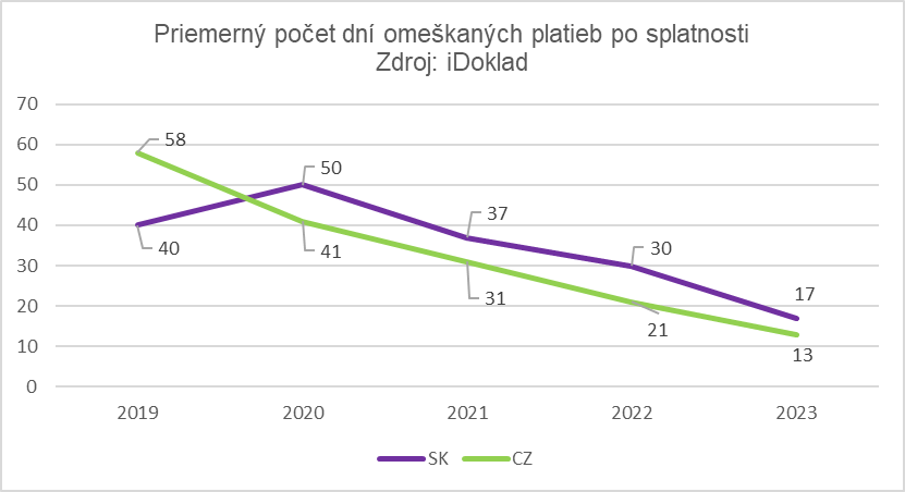 Zatiaľ čo v roku 2019 bolo u nás uhradených 86 percent podnikateľských faktúr, vlani sme zaznamenali pokles na úroveň 82 percent, a to napriek tomu, že mierne klesá podiel faktúr uhradených až po splatnosti. Kým v roku 2019 bolo po splatnosti uhradených 35 percent faktúr, v minulom roku to bol pokles o 5 percent. Ako u nás, tak aj u českých susedov, sa skracuje doba omeškania platieb. V minulom roku to bolo priemerne len 17 dní. V 2019 podnikatelia s úhradou meškali priemerne až 40 dní. Jediným prechodných obdobím, kedy sa počet týchto dní zvýšil, bol prvý rok pandémie covidu, kedy podnikatelia meškali s úhradami po splatnosti priemerne 50 dní.