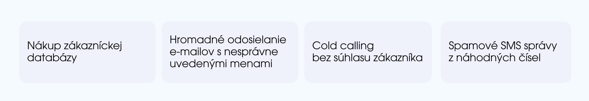 A to nehovoríme o príležitostnej chybe s pozdravom „Ahoj, {first name}“, ktorej sa pri odoslaní komunikácie obáva každý marketér či obchodník. Hovoríme o praktikách, ktoré narúšajú súkromie, porušujú legislatívu a vytvárajú zlé meno všetkým spoločnostiam. A okrem iného, veď to asi sami poznáte, keď vám kolega obchodník vyčíta akúkoľvek maličkosť, ktorá „nasrdila” práve jeho klienta.