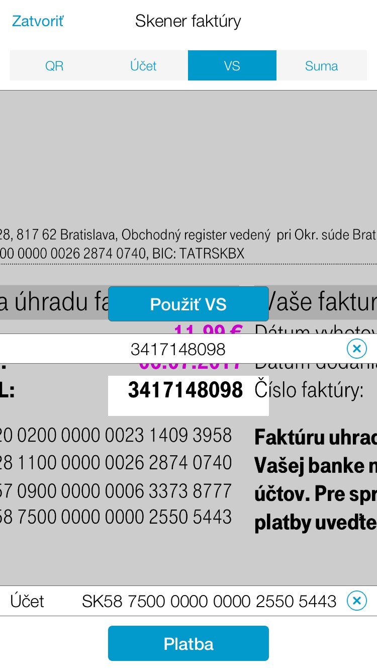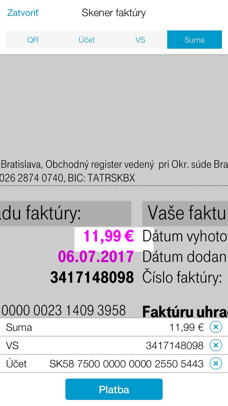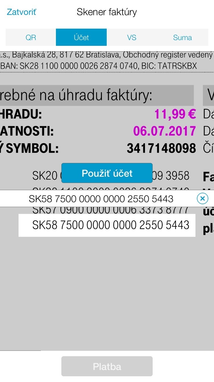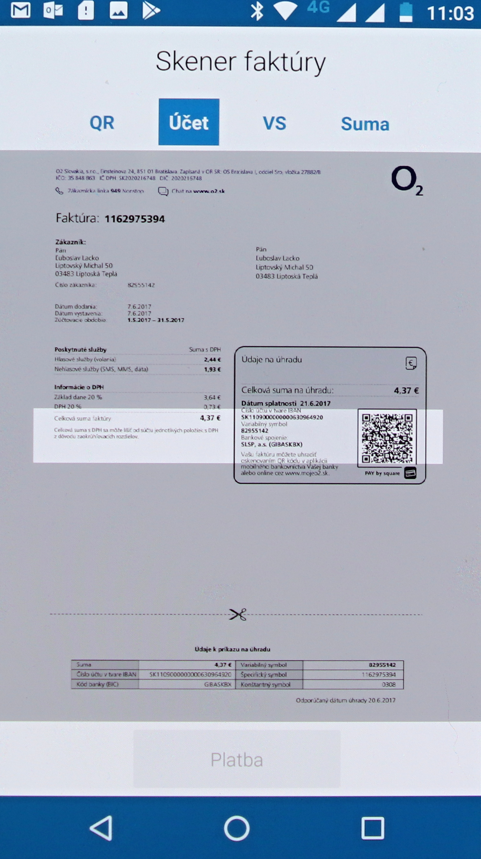 Služba funguje tak, že ak vám príde e-mail s faktúrou ako prílohou vo formáte PDF, v aplikácii na prezeranie dokumentov PDF ťuknete na symbol zdieľania a z ponúkaných možností vyberiete Importovať pomocou aplikácie SmartBanking. Obrazovka aplikácie na skenovanie údajov z PDF faktúry má štyri záložky: QR, Účet, VS a Suma. Ak faktúra nemá QR kód, aplikácia najskôr identifikuje číslo účtu vo formáte IBAN, na ktorý treba sumu na faktúre uhradiť. Každý skenovaný údaj je potrebné skontrolovať. Ak je číslo účtu správne, prepnete sa do záložky VS, kde sa identifikuje variabilný symbol, aby mohol príjemca vašu platbu identifikovať. V poslednej záložke sa identifikuje suma. Znovu odporúčame starostlivo skontrolovať všetky údaje. Následne tlačidlom Platba platbu potvrdíte. Aplikáciu sme testovali na bežných faktúrach od telekomunikačných operátorov a dodávateľov energií s QR kó-dom aj bez neho a aj v druhom prípade bola presnosť rozpoznávania stopercentná, keďže všet-ky faktúry boli kvalitné a texty na nich zreteľné.