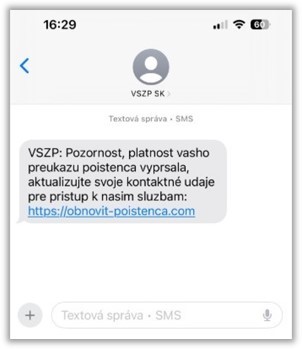 Všeobecná zdravotná poisťovňa vyzýva verejnosť k opatrnosti a upozorňuje na pretrvávajúcu smishingovú kampaň – podvodné SMS správy. Podvodníci v nich zneužívajú meno VšZP a posielajú podvodné SMS správy obsahujúce informáciu o konci platnosti karty poistenca. Poistenci nájdu informácie o smishingovej kampani aj v mobilnej aplikácii VšZP.