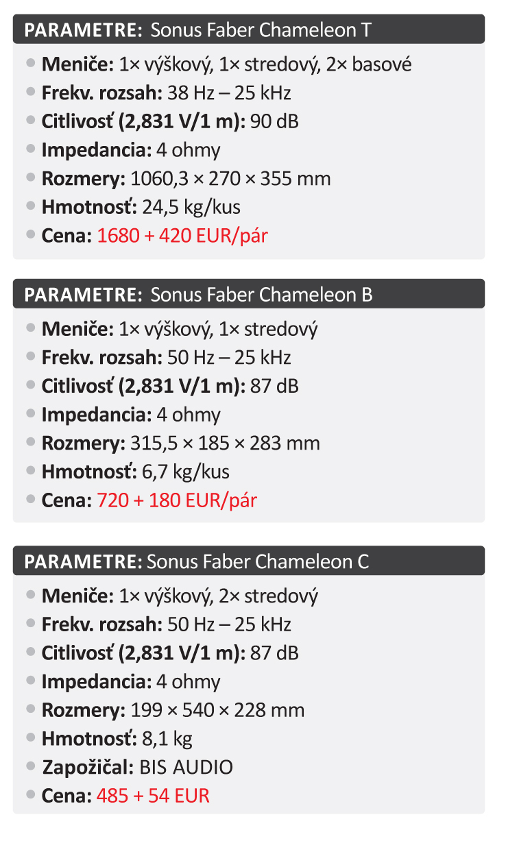 »Pri našom teste AV receivera Marantz SR6010 sekundovala špičková zostava reproduktorov Chameleon talianskej značky Sonus Faber. Tá pozostávala z dvojice stĺpových dební Chameleon T, dvojice policových Chameleon B a stredového Chameleon C. Reproduktory majú zaujímavú konštrukciu potiahnutú umelou kožou. Bočnice sú vymeniteľné a môžete si ich pri kúpe zvoliť, respektíve neskôr aj dokúpiť až v 6 farbách. Na prednej strane je odnímateľná ochranná mriežka. Vzhľadom na to, že reproduktory sa predávajú po pároch, respektíve stredový samostatne, možno si zostaviť ľubovoľnú konfiguráciu od stereo až po 9.1. Rad Chameleon výrobca tentoraz necieli do rúk audiofilov, ale skôr mladých používateľov, pre ktorých hrajú nezanedbateľnú úlohu dizajn a možnosti personalizácie. Nemožno však povedať, že by to malo byť na úkor kvality zvuku. Stĺpové reproduktory Chameleon T sú osadené dovedna 4 meničmi. Hore je 29 mm výškový reproduktor, 150 mm stredový s polypropylénovou membránou a 2 kusy 180 mm basových reproduktorov s polypropylénovou membránou. Sonus Faber udáva pre Chameleon T frekvenčný rozsah 38 Hz – 25 kHz, takže dokáže obsiahnuť celý frekvenčný rozsah aj bez použitia subwoofera, aj keď v prípade domáceho kina je subwoofer žiaduci. Udávaná citlivosť 90 dB/2,83 V/1 m je pomerne vysoká, jeho nominálna impedancia 4 ohmy znamená, že budete potrebovať zosilňovač schopný dodávať vyšší prúd. Efektové reproduktory Chameleon B sú policovej konštrukcie, osadené dvojicou meničov – 29 mm výškovým a 150 mm stredovým s polypropylénovou membránou. Udávaný frekvenčný rozsah je 50 Hz až 25 kHz. Stredový reproduktor Chameleon C je dizajnovaný naležato a osadený 29 mm výškovým meničom v strede a dvojicou 150 mm stredových s polypropylénovou membránou. Udávaný frekvenčný rozsah je 50 Hz až 25 kHz.