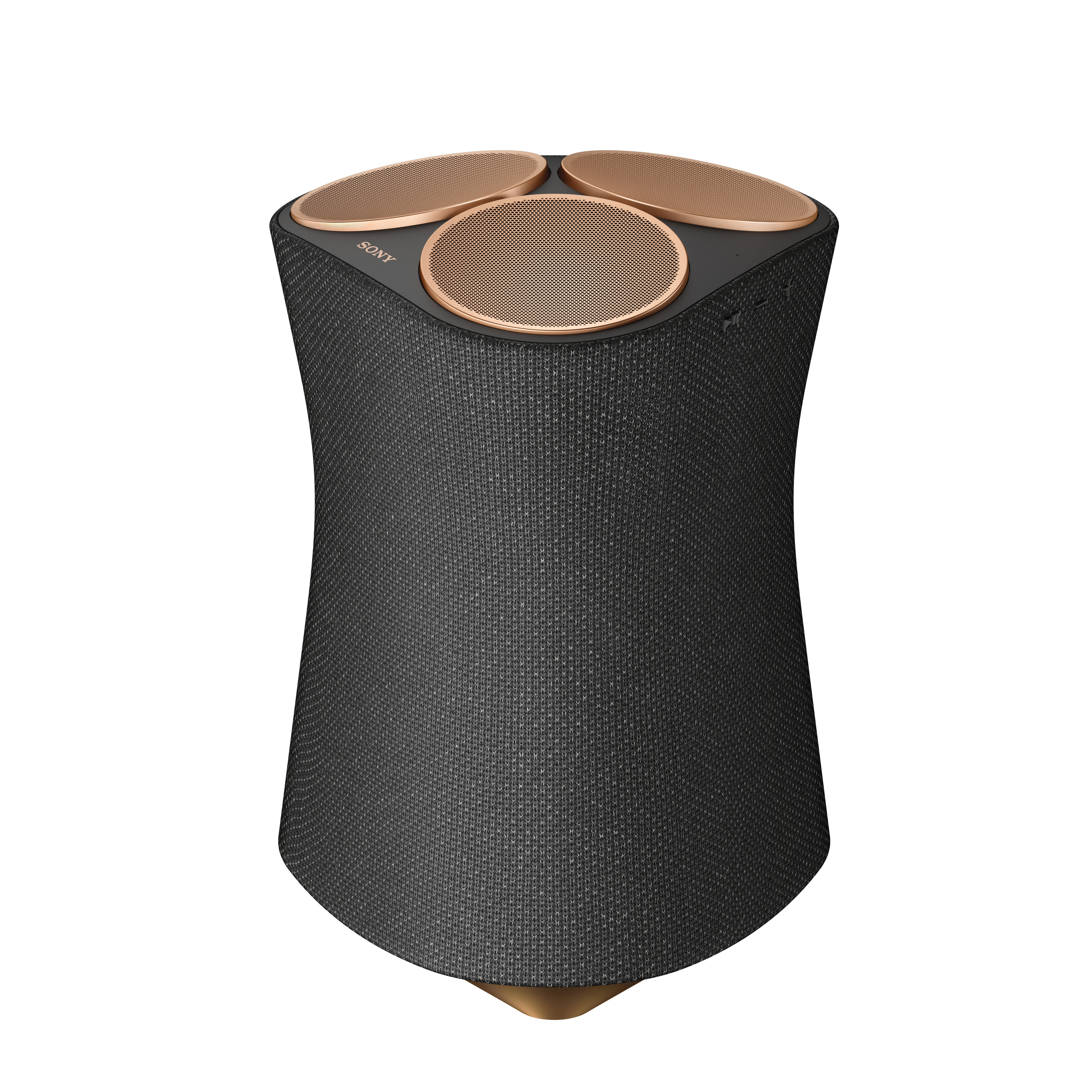 Tieto tri akustické meniče s priemerom 46 mm, určené na vytvorenie priestorového zvuku tak priamo, ako aj odrazom od stropu, dopĺňa ďalšia trojica strednotónových reproduktorov s rovnakým priemerom, ktoré sú rovnako rozmiestnené pod 120° uhlami, ale smerujú do strán. Reprodukciu basov má na starosti nízkotónový reproduktor s priemerom 70 mm, ktorý smeruje nadol a je doplnený basreflexovou trubicou vyvedenou dole v zadnej časti. Pojem vpredu alebo vzadu je pri tomto dizajnovo symetrickom reproduktore problematický, preto by mal byť reproduktor k miestu, odkiaľ ho budete počúvať, natočený hranou, na ktorej je v hornej časti logo Sony. Na ovládanie slúžia dve skupiny dotykových ovládacích prvkov na bočných stranách pomyselného trojuholníka tela reproduktora blízko hornej hrany. Nie je to veľmi praktické, ale zvyknete si. Telo reproduktora je pokryté hrubou priezvučnou látkou. Externý napájací zdroj s výkonom 120 W sa pripája zospodu.