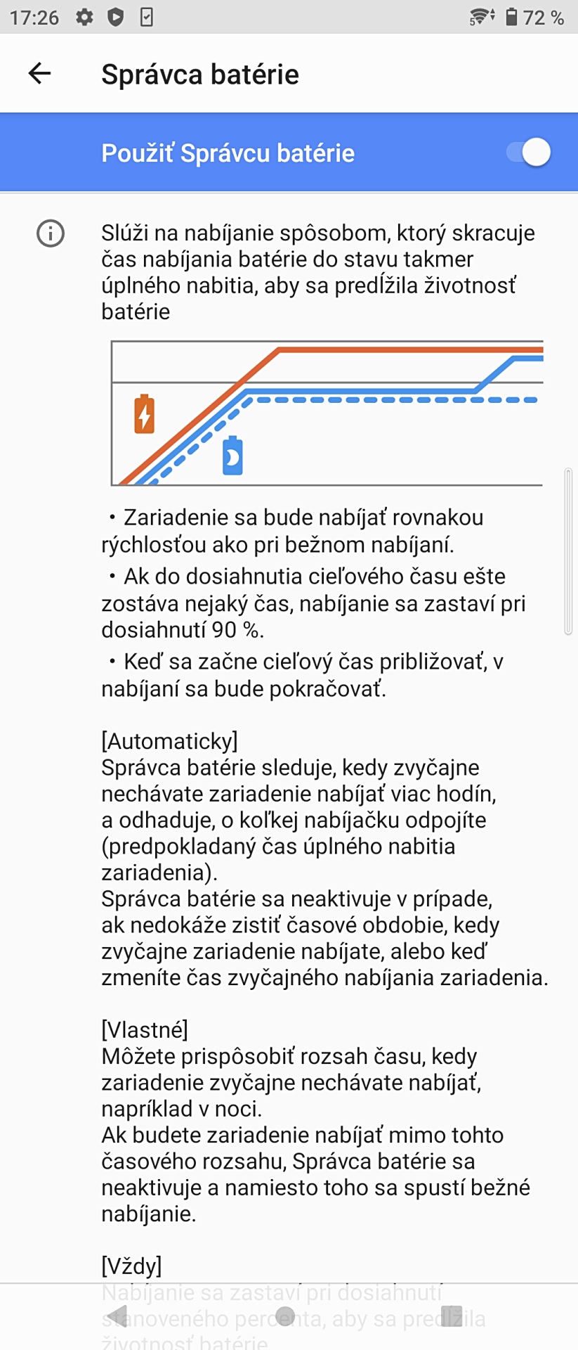 Naproti tomu Sony večer po pripojení nabíjačky nabije smartfón na 90 %. Umelá inteligencia v smartfóne monitoruje vaše zvyklosti a odhadne kedy ráno smartfón odpájate. V dostatočnom predstihu pred odhadnutým časom aktivuje nabíjanie, aby bol ráno smartfón nabitý na 100 % Ak by ste aj museli v priebehu noci niekam neplánovane odísť, nič sa nedeje, máte smartfón dostatočne nabitý na 90 %. Pri používaní som si všimol, že keď sa dostanem do oblasti veľmi slabého WiFi signálu, Xperia 10 III sa nesnaží za každú cenu zostať pripojená k tejto sieti, ale včas sa prepne na mobilné dáta.