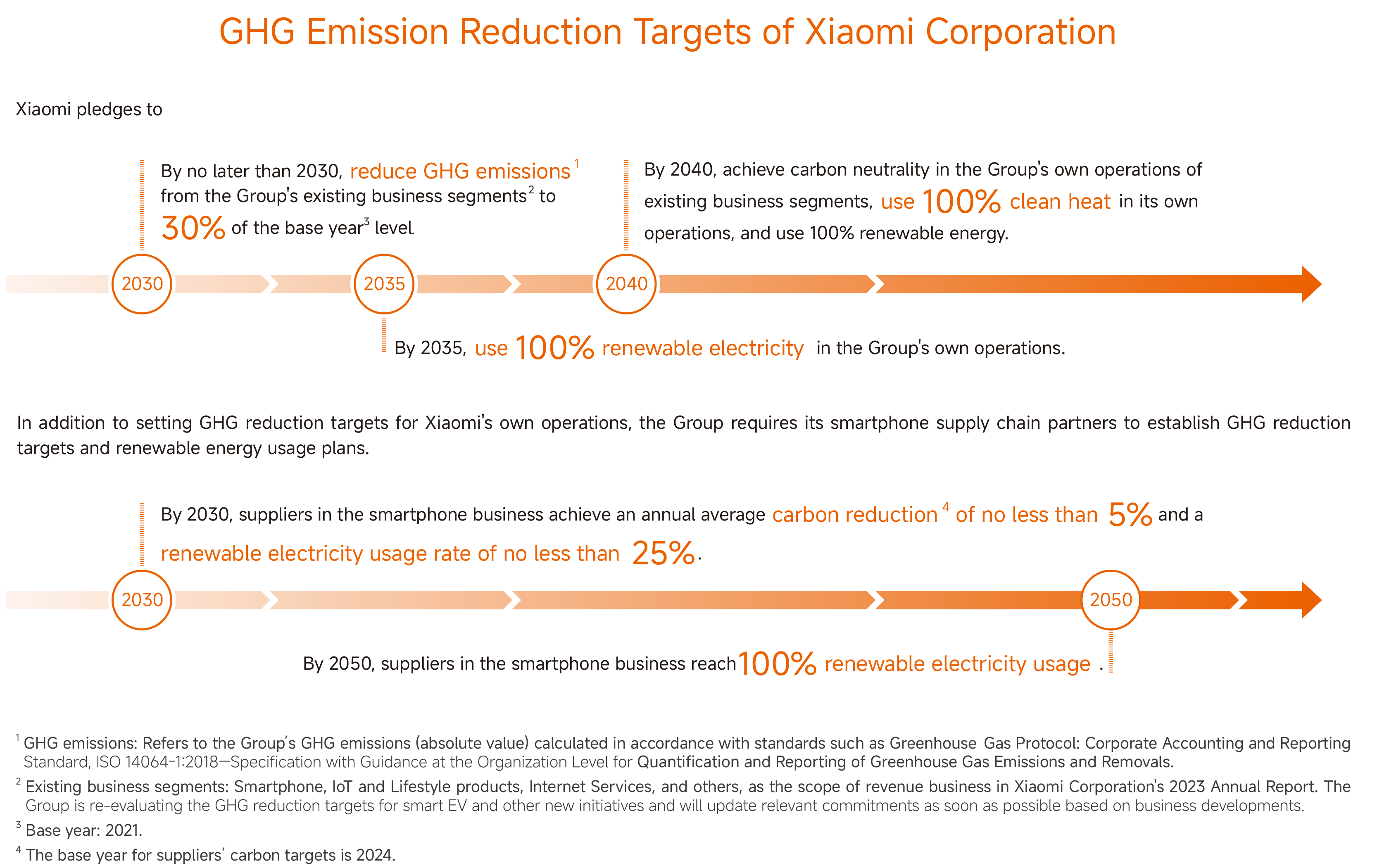 Okrem stanovenia cieľov na znižovanie emisií skleníkových plynov (GHG) vo vlastných prevádzkach, Xiaomi tiež vyžaduje od svojich partnerov v dodávateľskom reťazci smartfónov, aby tiež stanovili ciele na znižovanie emisií skleníkových plynov a plány na využívanie obnoviteľných zdrojov energie. Do roku 2030 musia dodávatelia v oblasti smartfónov dosiahnuť priemerné ročné zníženie emisií oxidu uhličitého o minimálne 5 % (rok 2024 sa berie ako štartovný) a zvýšiť mieru využívania obnoviteľnej elektrickej energie o minimálne 25 %. Do roku 2050 sa od dodávateľov smartfónov spoločnosti Xiaomi očakáva, že dosiahnu 100-percentné využívanie obnoviteľnej elektrickej energie.
