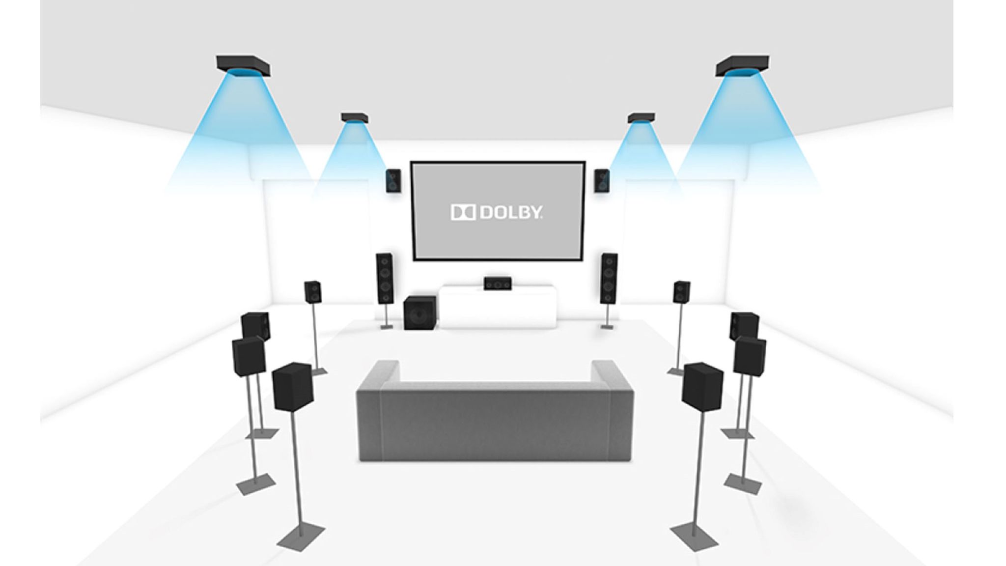 1. Dolby Atmos: Táto technológia prináša priestorový zvuk, ktorý sa šíri nielen horizontálne, ale aj vertikálne, čím vytvára trojrozmerný zvukový priestor. Dolby Atmos umožňuje, aby zvuky presne reflektovali pohyb v priestore, čo zvyšuje realistickosť zážitku. Na rozdiel od bežných zostáv, kde sa označuje počet kanálov napríklad 3.1, 5.1, 9.1, čo znamená počet efektových kanálov + subwoofer, pri Dolby Atmos je ešte pridaná informácia o vrchných kanáloch, napríklad 5.1.2 alebo 9.1.4, kde tretie číslo udáva počet vrchných kanálov. Výhodné je, že aj vtedy, ak je film namixovaný napríklad na 9.1.4 kanálov, zvukový procesor ho vždy prepočíta na všetky kanály, ktoré sú k dispozícii. Vrchné kanály sa riešia pri bežných zostavách domáceho kina prostredníctvom stropných reproduktorov. Pri riešení zabudovanom v televízore alebo v soundbaroch sa využívajú meniče namierené šikmo do stropu, ktoré odrážajú zvuk od stropu k poslucháčovi. Rovnako aj rozšírené efektové kanály.