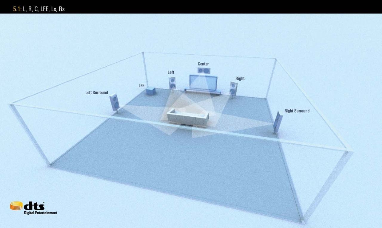 Staršie systémy ako DD alebo DTS nepoužívajú vrchné efektové kanály. Zobrazená DTS 5.1