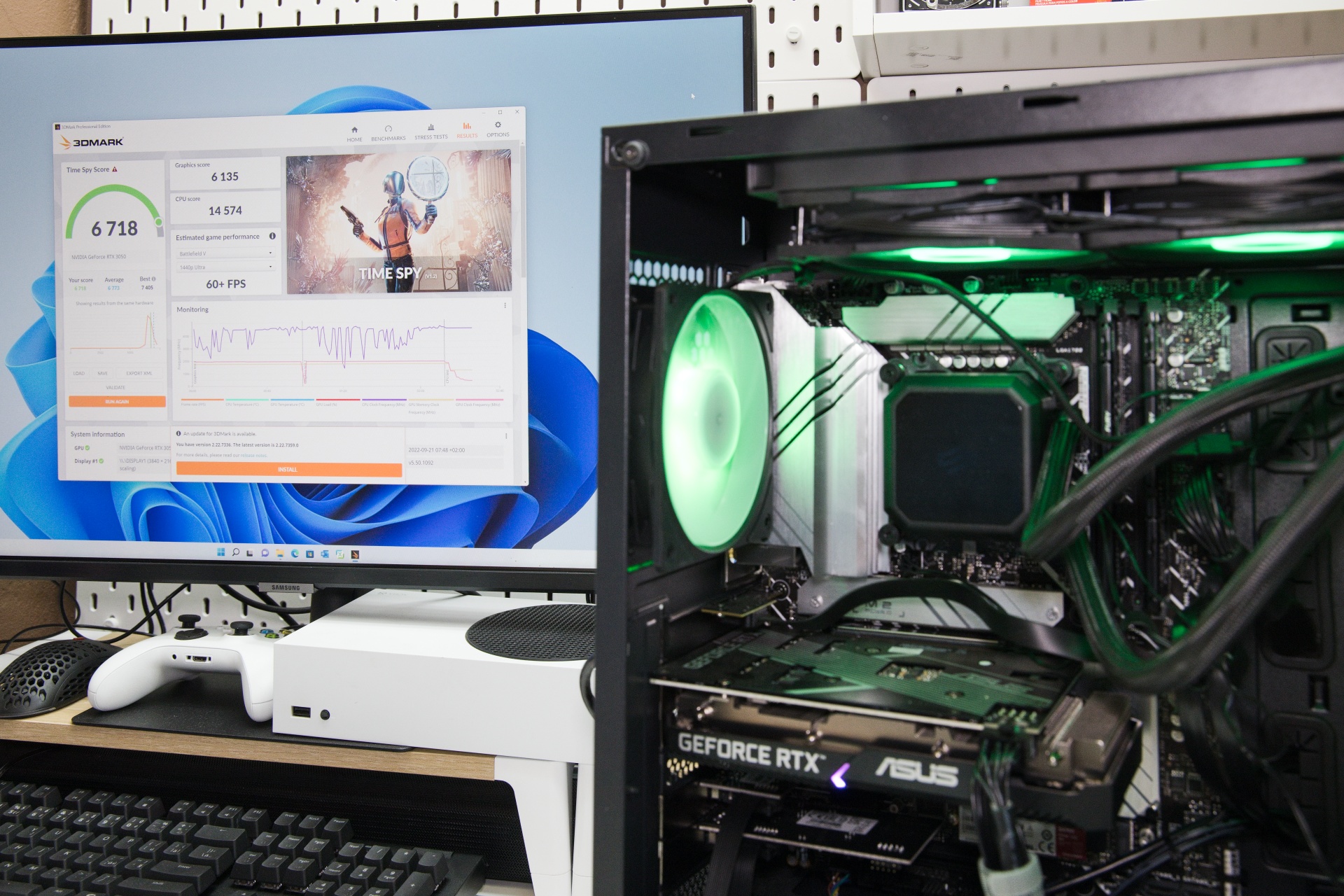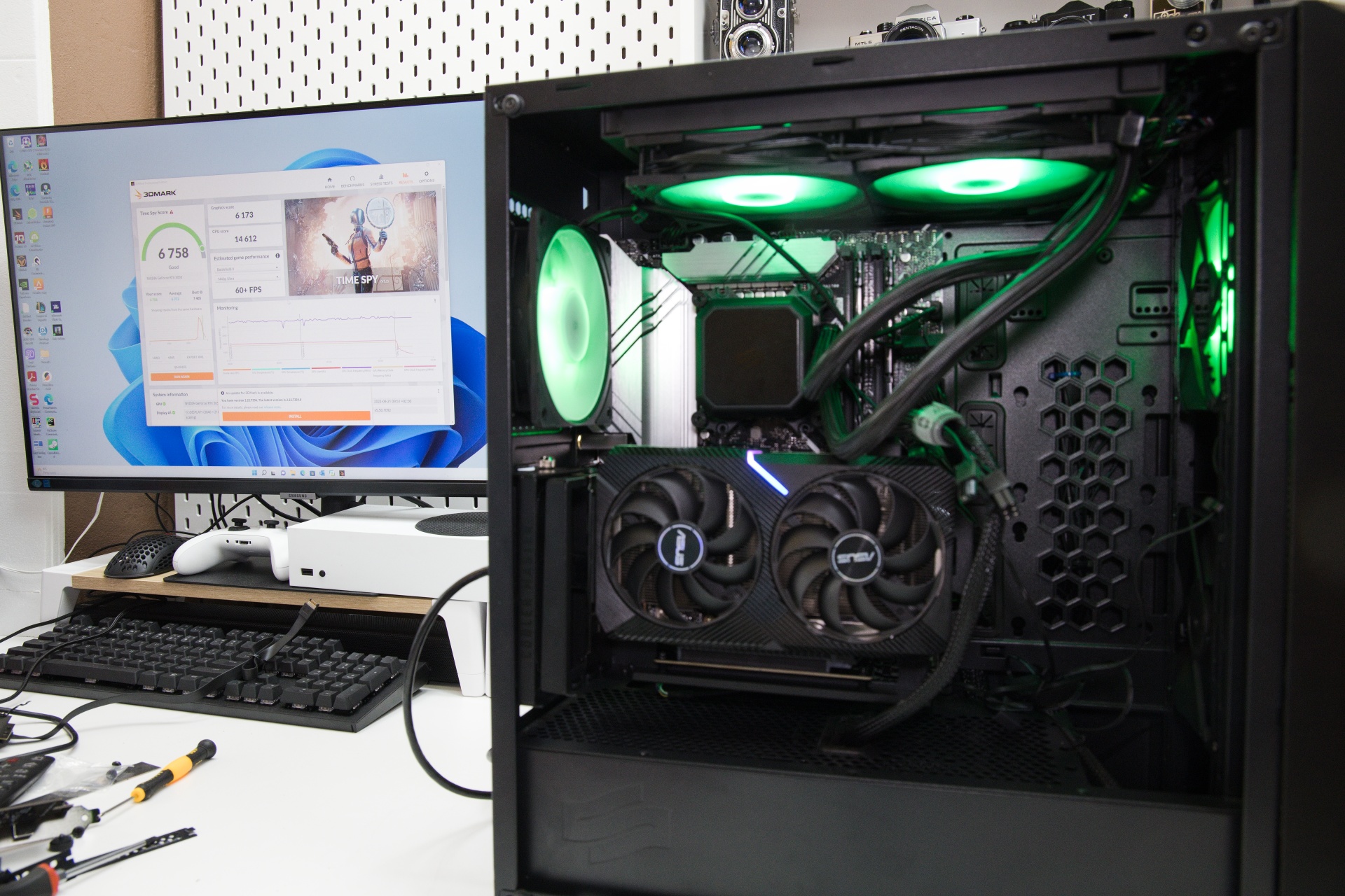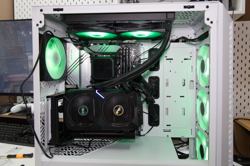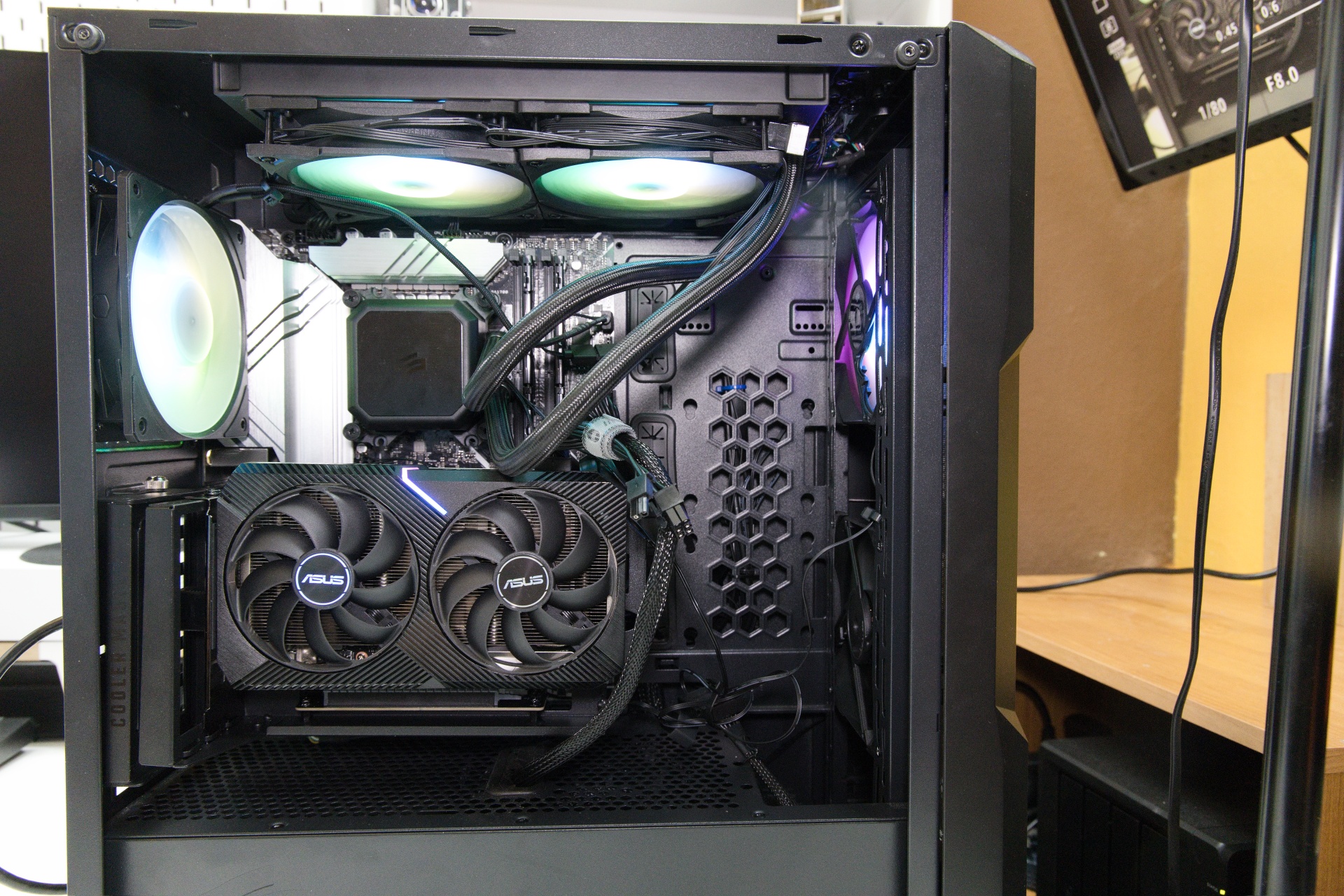 Samozrejme urobil som aj benchmarkové testy pre klasickú aj vertikálnu montáž. Zaujímal ma len prípadný vplyv kábla, takže som testoval v otvorenej skrini. V počítači, ktorý používam na editovanie videí a občasné hranie mám totiž len „dočasnú“, relatívne lacnú grafickú kartu MVIDIA GeForce RTX3050, pretože už na jar, keď som ju kupoval som vedel, že NVIDIS na jeseň predstaví produktovú novú rodinu RTX 4000. Keď sa niektorá výkonnejšia karta, napríklad RTX4080 dostane na akceptovateľnú cenu nahradím žolíka finálnou grafikou a potom urobím aj porovnanie účinosti chladenia klasickej a vertikálnej montáže.