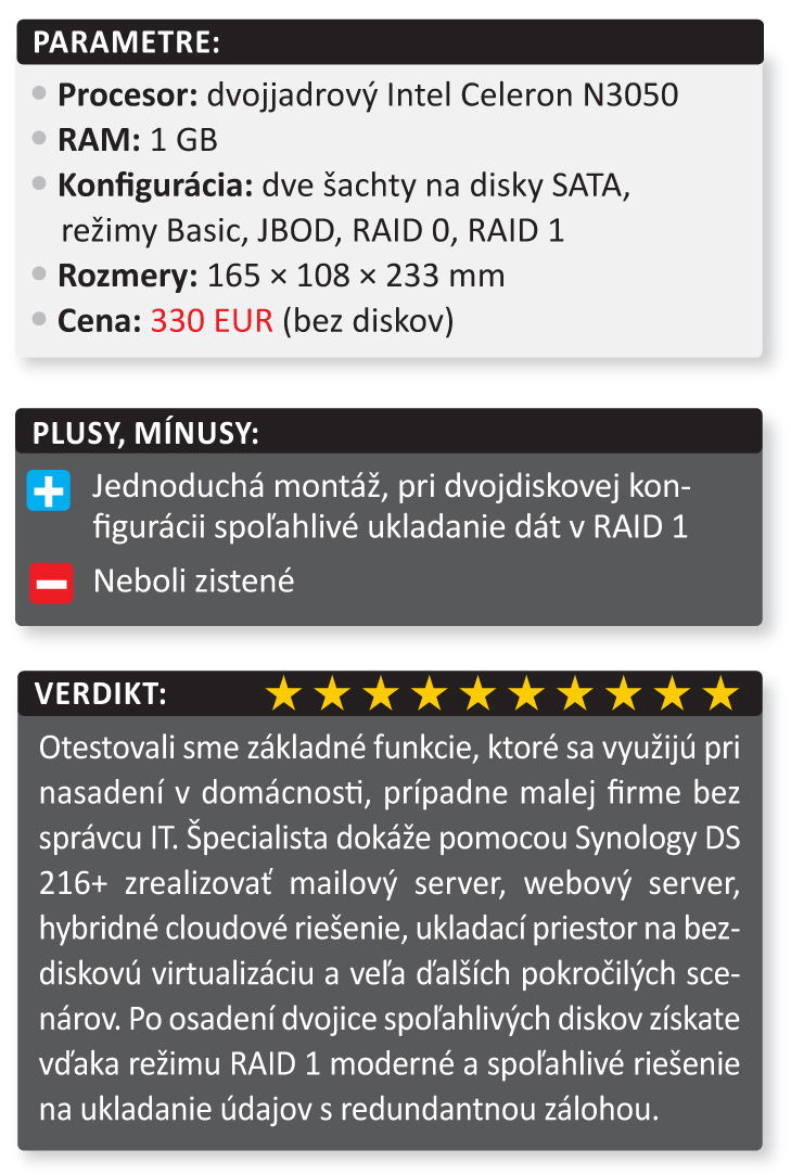 DS216+ využíva operačný systém DiskStation Manager (DSM), ktorý ponúka rozsiahle portfólio aplikácií od zálohovania cez multimédiá až po nástroje na efektívnu prácu. Súborový systém Btrfs poskytuje pokročilú ochranu súborov vrátane obnovy typu point-in-time. Prehľadný súborový manažér umožňuje manipuláciu so súbormi aj cez webové rozhranie. Download Station ponúka možnosť sťahovať súbory z internetu cez BT, FTP, HTTP, NZB aj torrenty priamo z NAS, takže pri sťahovaní veľkých súborov môžete túto úlohu zveriť NAS a následne vypnúť PC a šetriť energiu. Špecialitou zariadenia je transkódovanie videoobsahu v reálnom čase, takže ak máte na disku uložené video v rozlíšení 4K (H.264) a pozeráte si ho na 4K televízore, bude streamované v natívnom rozlíšení. No ak video pozeráte na zariadení s nižším rozlíšením displeja, napríklad tablete s full HD displejom, bude video v reálnom čase prekódované a streamované v rozlíšeni 1080p. Aj to bol zrejme dôvod, prečo sa v najnovšej verzii dosiaľ používaný procesor ARM nahradil dvojjadrovým Celeronom, ktorý okrem vyššieho výkonu podporuje technológiu šifrovania Intel AES-NI (New Instructions). Maximálna prenosová rýchlosť pri čítaní a zapisovaní je 111 MB/s. Pri tejto rýchlosti funguje aj prenos šifrovaných dát. Transkódovanie videa v praxi znamená, že si môžete ukladať videá v najvyššom rozlíšení a streamovať ich bez ohľadu na koncové zariadenia či limitáciu internetového pripojenia. Aplikácia Video Station okrem prehľadného organizovania filmov, seriálov a domácich videí umožňuje aj automatické sťahovanie metadát z internetu. Audio Station umožňuje streamovať hudbu do mobilných zariadení, zariadení podporujúcich DLNA a AirPlay a v novej verzii 6.0 aj do hodiniek Apple Watch. Cez Photo Station si môžete organizovať albumy fotografií a selektívne ich zdieľať. Pomocou aplikácie Cloud Station si môžete vytvoriť vlastný autonómny Dropbox, nad ktorým budete mať úplnú kontrolu. K dispozícii sú aj mobilné aplikácie pre iOS, Android a Windows Phone.