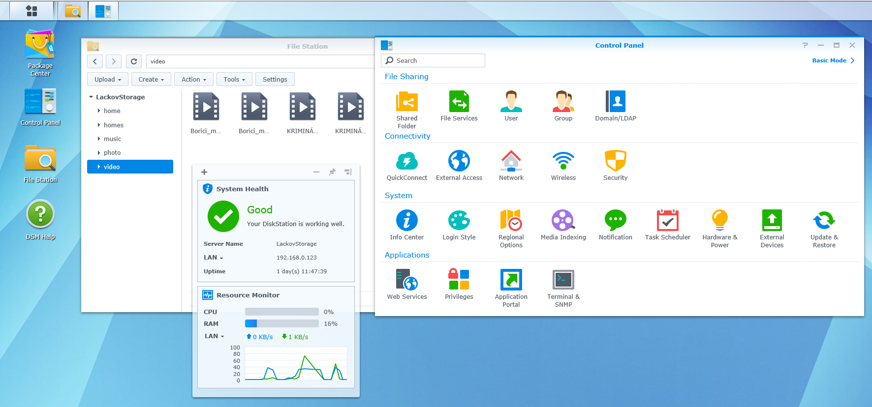 NAS sme dostali s nainštalovaným operačným systémom DSM 5.2. Na webe bola v čase testovania už verzia Release Candidate DSM 6.0, no odolali sme pokušeniu na upgrade, pretože na stránke bolo upozornenie, že táto akcia je nevratná. Testovali sme teda s aktuálnou komerčnou verziou firmvéru. Inicializácia nového zariadenia trvá asi 15 minút. Využili sme disky „zo šuflíka“ a o to viac sme ocenili možnosť inštalovať 2,5 a 3,5-palcové modely. Na testovanie, prípadne ukladanie a rodinné zdieľanie multimédií vyhovie akýkoľvek disk, no znovu zdôrazňujeme, aby ste do reálneho nasadenia vo firmách či kanceláriách nainštalovali čo najkvalitnejšie disky, najlepšie nové. Údaje sú najcennejšie aktívum, takže šetrenie sa v tomto prípade nevypláca. Po identifikácii NAS v sieti nasleduje proces konfigurácie. Naformátujú sa disky a nainštaluje sa DiskStation Manager. Nasleduje konfigurácia používateľských účtov, aby ste mohli úložný priestor zdieľať s rodinou, priateľmi alebo kolegami. Pre každé konto možno nastaviť zdieľané aj privátne zložky, do ktorých si používateľ ukladá svoje dôverné súbory a dokumenty. Pri nasadení v malej firme či kancelárii môžete pre jednotlivých používateľov nastaviť diferencované privilégiá. Konfiguráciu viacerých používateľských účtov s rovnakými privilégiami vám uľahčí možnosť definovať skupiny používateľov. Nielen konfigurácia, ale aj správa je vďaka automatizácii jednoduchá a intuitívna. V pohode to zvládnete z dotykového displeja tabletu či dokonca smartfónu. Vyskúšali sme aj automatickú synchronizáciu, a to nielen adresárov v počítači, ale aj súborov v cloudových službách OneDrive, Dropbox a Google Drive.