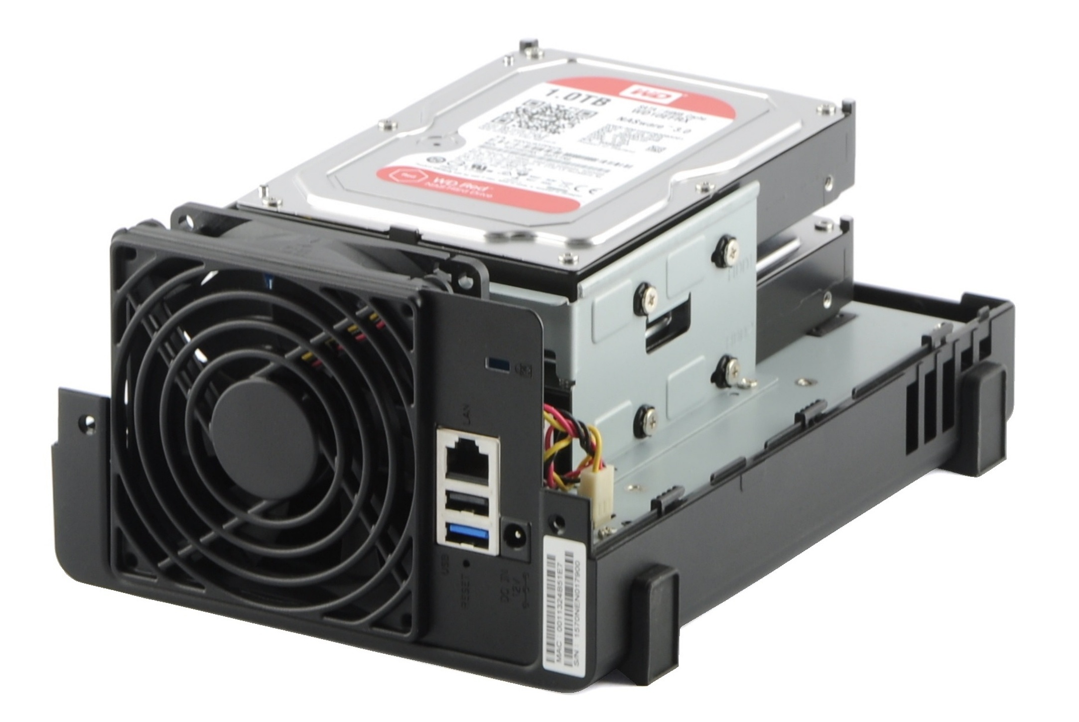 Montáž je jednoduchá, kryt rozoberiete obzvlášť rýchlo a jednoducho. Disky sa k šachtám pripevňujú skrutkami cez gumené krúžky, ktoré eliminujú vibrácie. Nejaké chvenie síce na kostru i cez ne prejde, no v druhej vlne ho pohltia gumené nožičky, vďaka ktorým NAS nerozozvučí dosku pracovného stola ani sa nekĺže. Konštrukcia je v každom smere zvládnutá na výbornú.