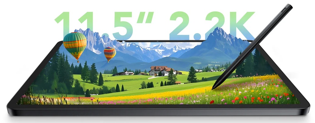 Čipová súprava 6 nm MediaTek Helio G100, osemjadrová (2 × 2,2 GHz Cortex-A76 + 6 × 2,0 GHz Cortex-A55), GPU Mali-G57 MC2, 8 GB RAM; úložný priestor 256 GB; 11,5" IPS LCD, 2200 × 1440 px, 3:2, jas: 450 nitov, max. jas: 500 nitov, obnovovacia frekvencia 120 Hz; fotoaparáty: zadný 8 Mpx AF f/2,0, predný 8 Mpx; konektivita: Wi-Fi 6, Bluetooth v5.3; 4 reproduktory; batéria: 8000 mAh; operačný systém Android 15; rozmery: 260,5 × 176,8 × 6,5 mm; hmotnosť: 490 g