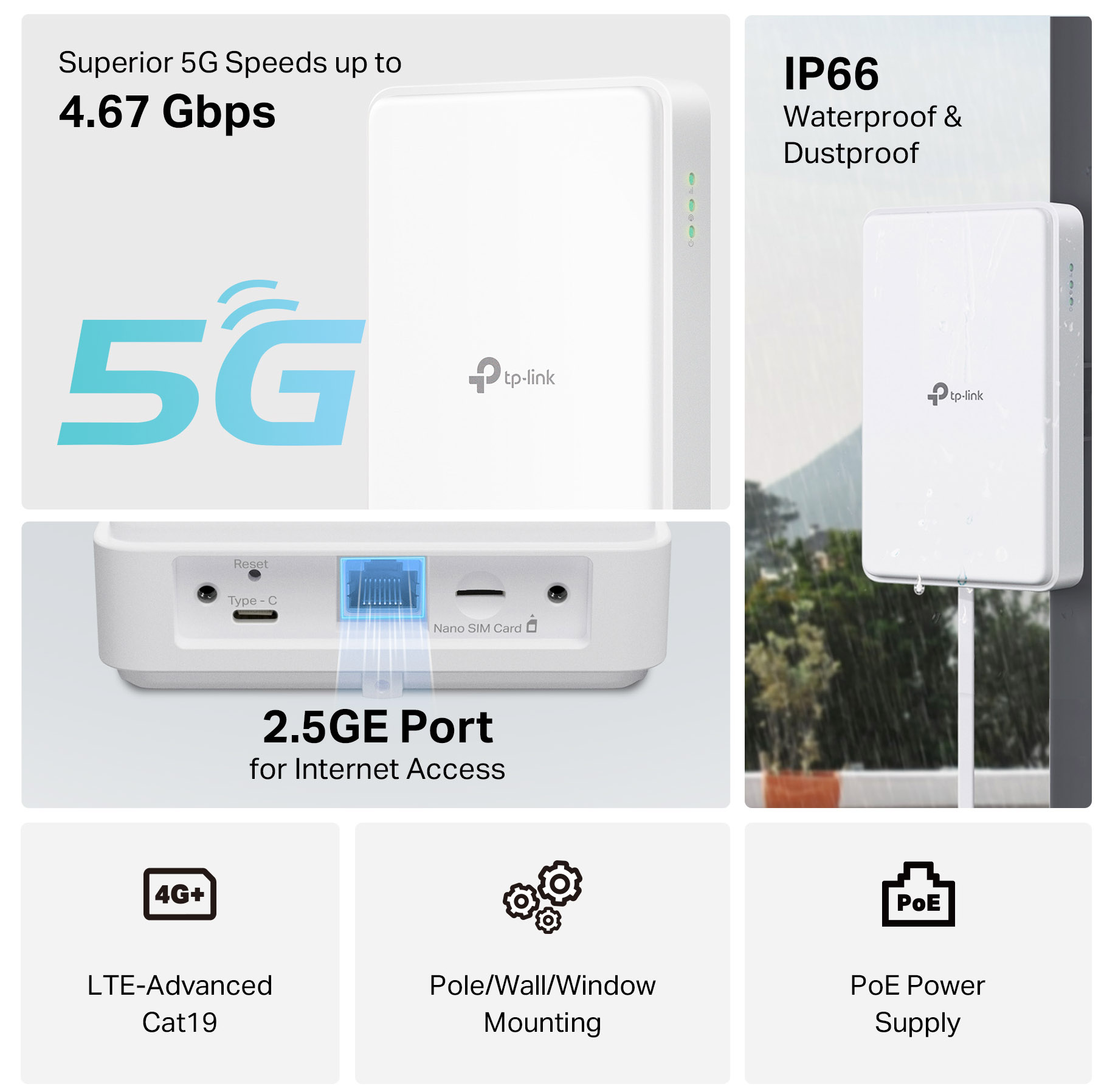 Router TP-Link NE200-Outdoor poskytuje rýchlosť sťahovania až 4,67 Gb/s, čo umožňuje bezproblémové streamovanie videí vo vysokej kvalite, hranie online hier aj súčasné pripojenie viacerých inteligentných zariadení. Podporuje aj 4G LTE s rýchlosťou až 1,6 Gb/s, ktoré slúži ako spoľahlivá záloha v prípade nedostupnosti 5G siete. Vďaka širokej kompatibilite s kľúčovými 5G, 4G a 3G pásmami je zariadenie pripravené na použitie prakticky kdekoľvek.