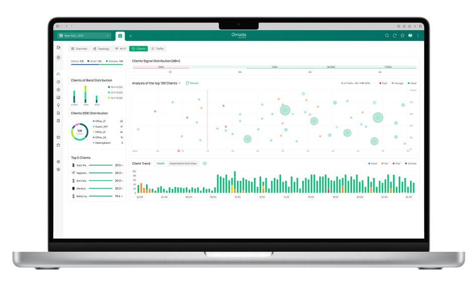 Omada Network V6.0 predstavuje modernizovanú konzolu s piatimi hlavnými sekciami: Prehľad, Topológia, Wi-Fi, Klienti a Prevádzka. Používatelia získajú prehľad o stave siete, vyťažení zariadení aj správaní klientov. Grafické prvky, ako mapa hustoty prístupových bodov alebo teplotná mapa sieťovej prevádzky, umožňujú rýchlo identifikovať zaťažené oblasti a efektívne plánovať rozširovanie infraštruktúry.