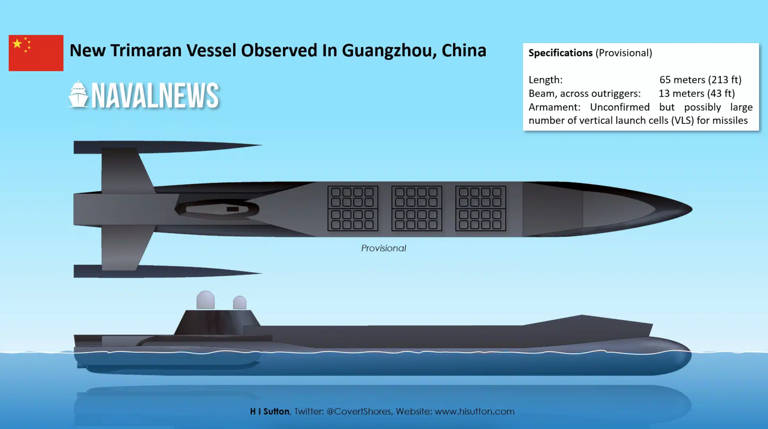 Satelitné snímky odhalili plavidlo natreté tmavosivou alebo čiernou farbou s dĺžkou trupu približne 65 metrov. Jeho dizajn naznačuje, že Čína experimentuje s novou, radikálnou námornou technológiou. Najvýraznejšou črtou plavidla je jeho trup typu trimaran.