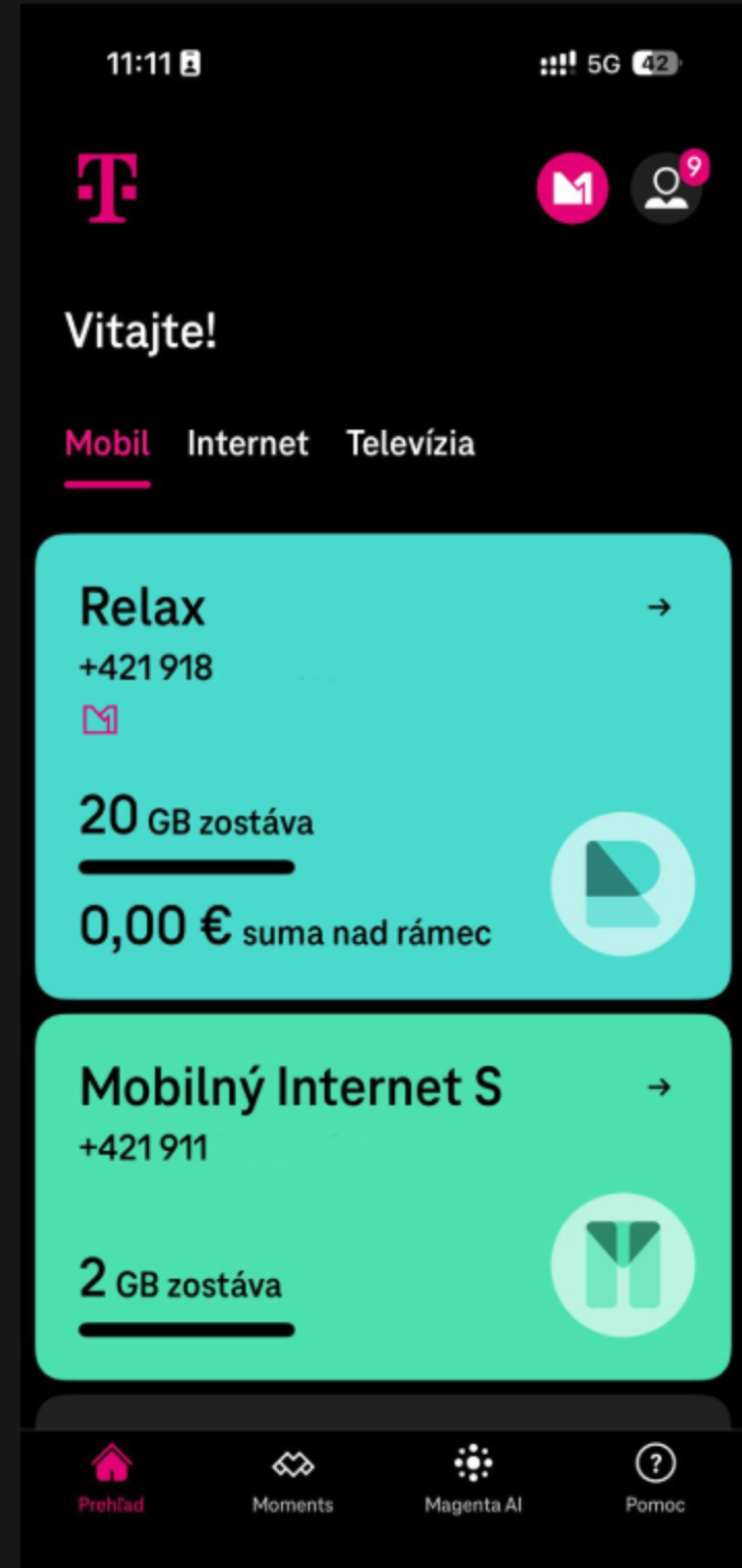 Aplikácia zároveň prináša prehľadnejšie rozdelenie služieb do troch záložiek: Mobil, Internet a Televízia. Tlačidlo Platby a faktúry sa presunulo priamo pod zoznam služieb, čím sa zjednodušil prístup k najdôležitejším informáciám. Zákazníci, ktorí sú súčasťou skupiny Magenta 1, nájdu svoje benefity pohodlne vpravo hore vedľa profilu.