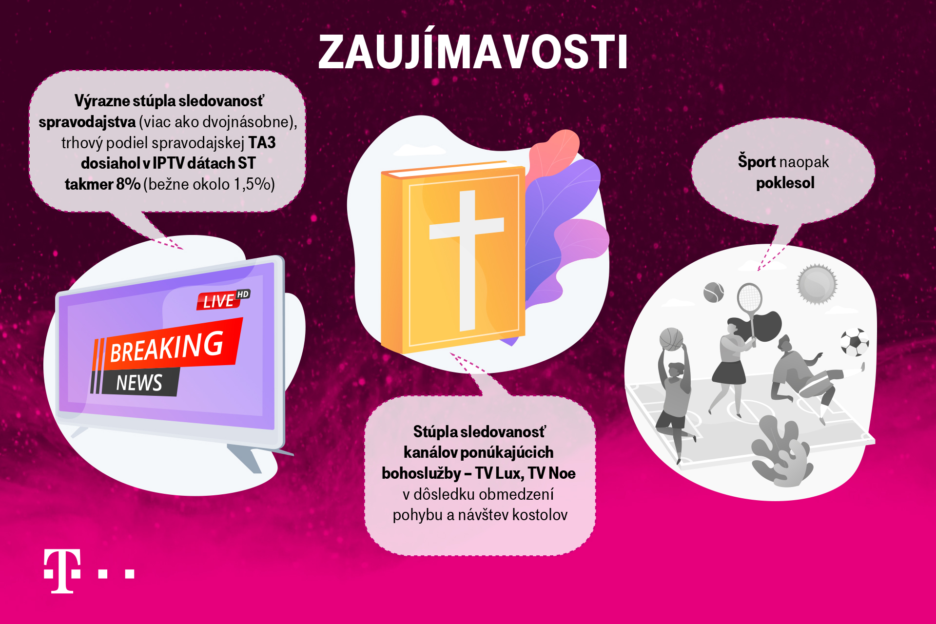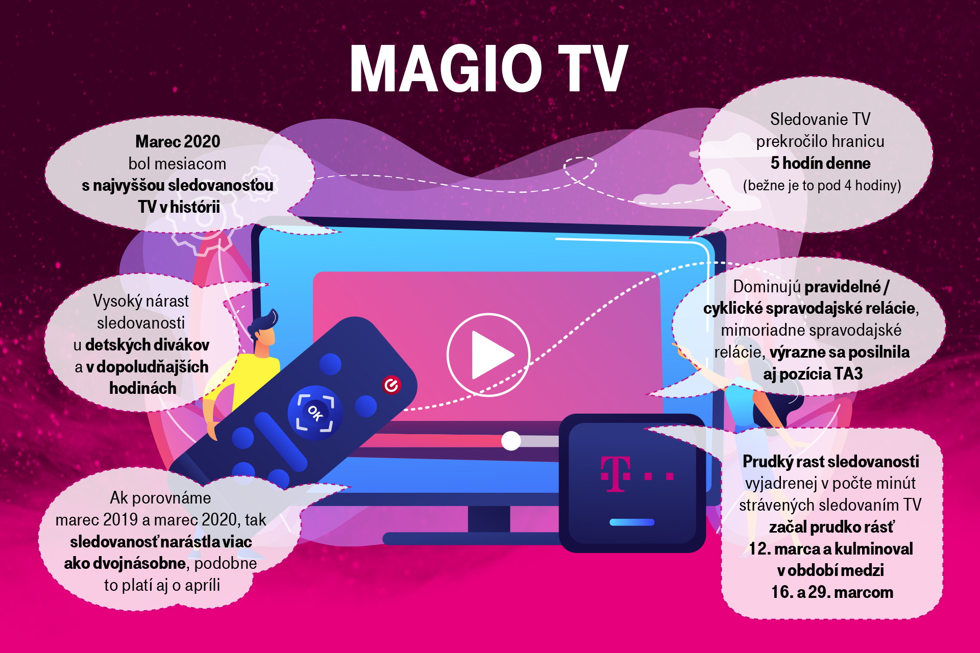 Telekom reaguje na potreby svojich zákazníkov a v spolupráci s HBO prináša kvalitný video obsah v službe HBO GO na mesiac zadarmo. Ako vyplýva z prieskumu spoločnosti Kantar, sledovanosť televízie počas marca a apríla lámala rekordy v celej Európe. Inak tomu nebolo ani na Slovensku, pričom marec sa stal mesiacom s najvyššou sledovanosťou v histórii merania televízie od roku 2004. Každý deň sledovalo TV priemerne viac ako milión Slovákov, čo prekonalo aj tradične najsilnejšie televízne Vianoce. TV kanály či filmy zadarmo patrili počas uplynulých dvoch mesiacov u zákazníkov Slovak Telekomu medzi najobľúbenejšie benefity, ktoré operátor v tomto období priniesol.