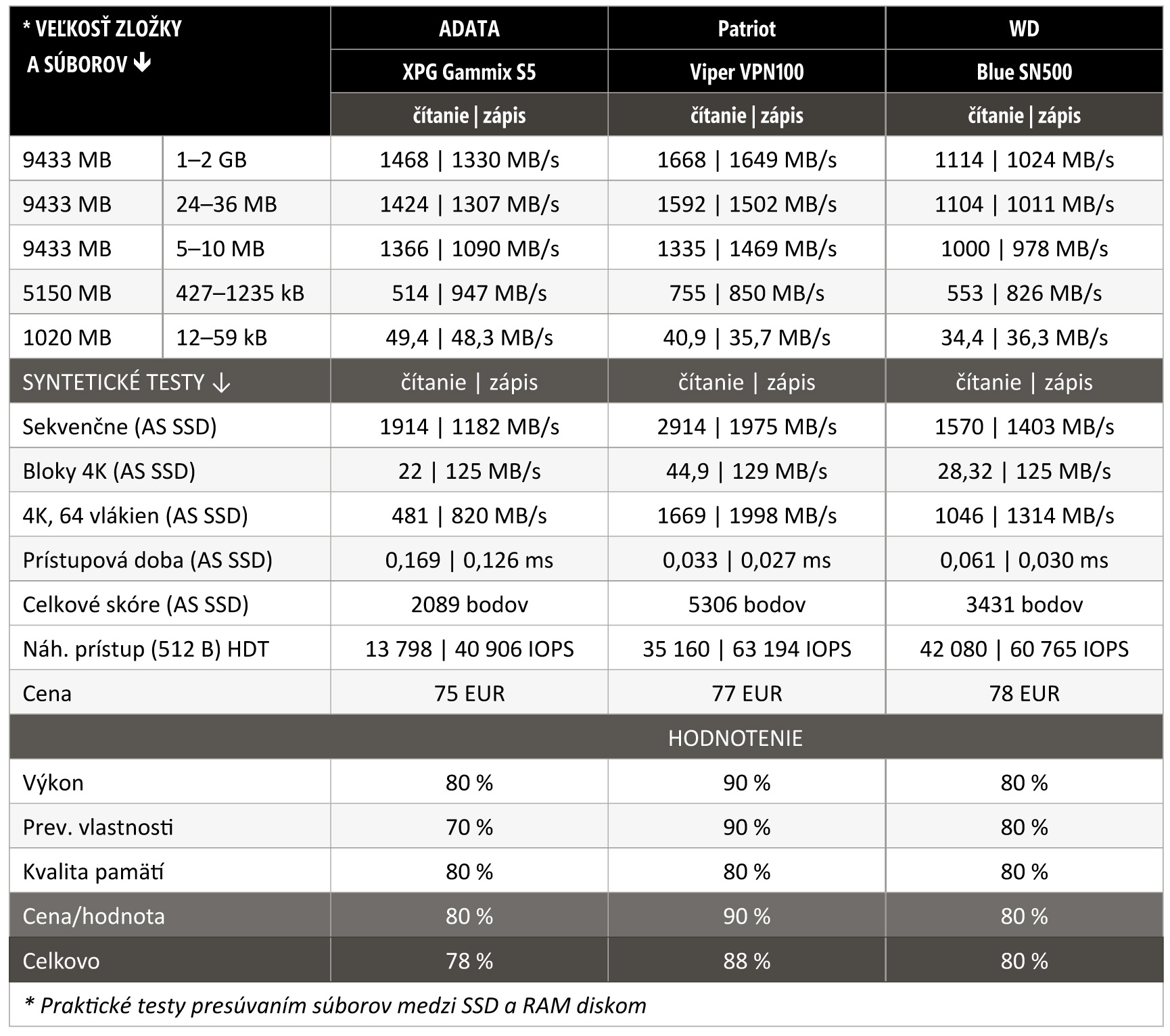 Po presne vytýčenej kapacite a cene sme do tretice stanovili aj minimálny udávaný výkon, respektíve maximálnu rýchlosť zápisu, a to aspoň 1400 MB/s. V tomto smere o polovicu pomalšie SSD sú lacnejšie rámcovo iba o niekoľko eur. Do testu sme skrátka obsadili komplexne výkonné, cenovo dostupné SSD, ktoré sú stále výrazne lacnejšie než populárne Samsung 9x0 Evo. A takých veru mnoho nie je. Suverénne najatraktívnejšie sa papierovo javia ADATA XPG Gammix S5, Patriot Viper VPN00 a WD Blue SN500. Všetky tri SSD spájajú pamäte typu TLC, no k ostatnému už každý model pristupuje trochu inak.