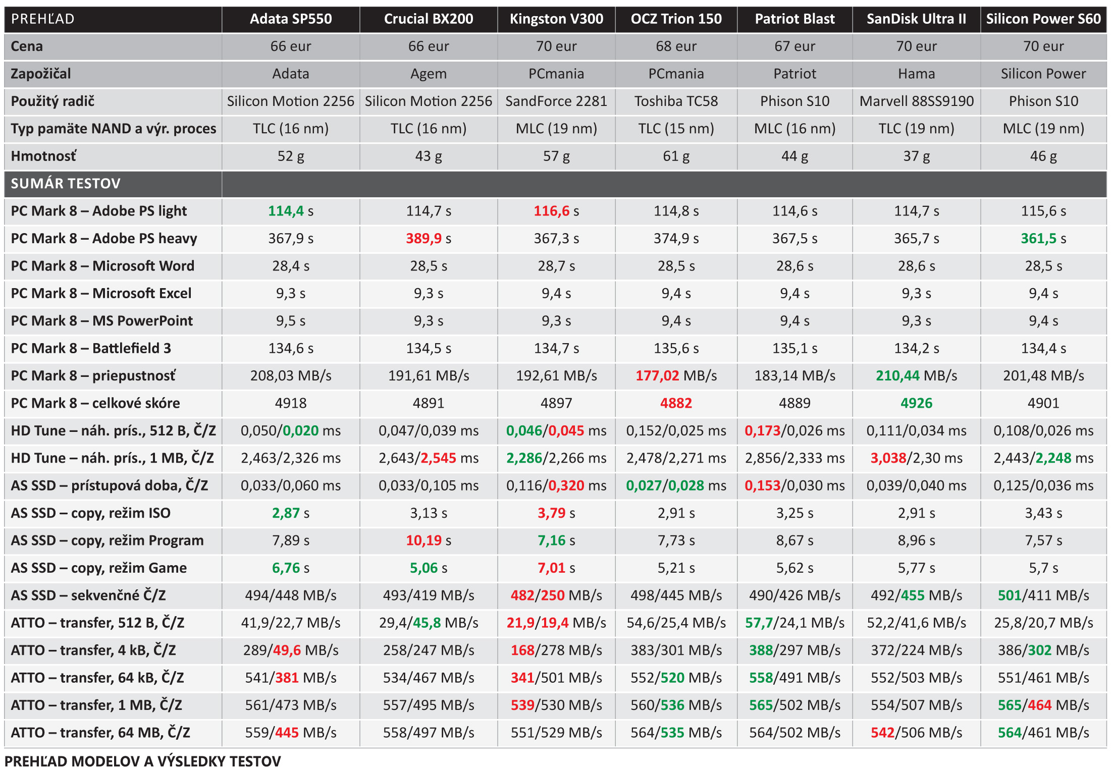 Musíme poznamenať, že každé z testovaných SSD je citeľne rýchlejšie než tradičný platňový disk. Keď ich však porovnáme medzi sebou, vzájomné rozdiely nie sú (minimálne pri tých lepších) zásadné. No všetky majú nejaké špecifiká.