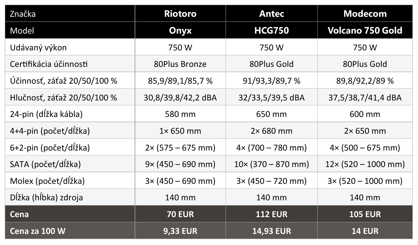 Semimodulárny Riotoro Onyx má certifikovanú najnižšiu účinnosť – 80Plus Bronze, ale takisto je najlacnejší a v teste má zastupovať pomyselnú spodnú hranicu, nad ktorou má ešte zmysel pri drahšom počítači uvažovať. Proti sebe stoja však i dva „zlaté“ (s 80Plus Gold), každý poňatý trochu inak.