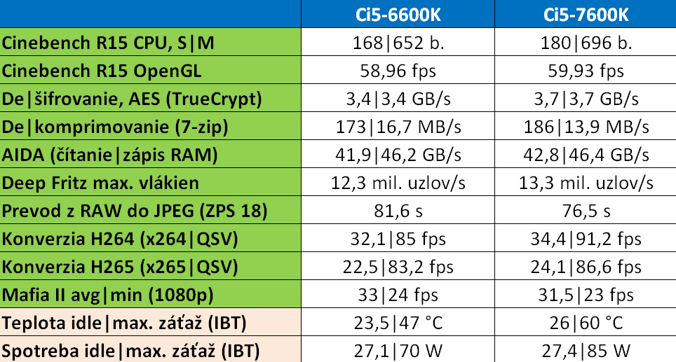 Takt na takt (IPC) je výkon Kaby Laku síce rovnaký ako v prípade Skylaku, pozoruhodné je prevádzkové napätie jadra, pri akom je schopné fungovať. V tomto smere sa rozhodne nevypláca nechať v BIOS-e položku Vcore na nastavení „auto“. Na test sme mali dva „rôzne“ procesory – jeden bol na inak východiskových nastaveniach schopný prevádzky pri 1,06 V a lepšiemu kusu kremíka stačilo iba 1,04 V. Na porovnanie, továrensky nižšie taktovaný 6600K na stabilný chod požadoval 1,08 V.