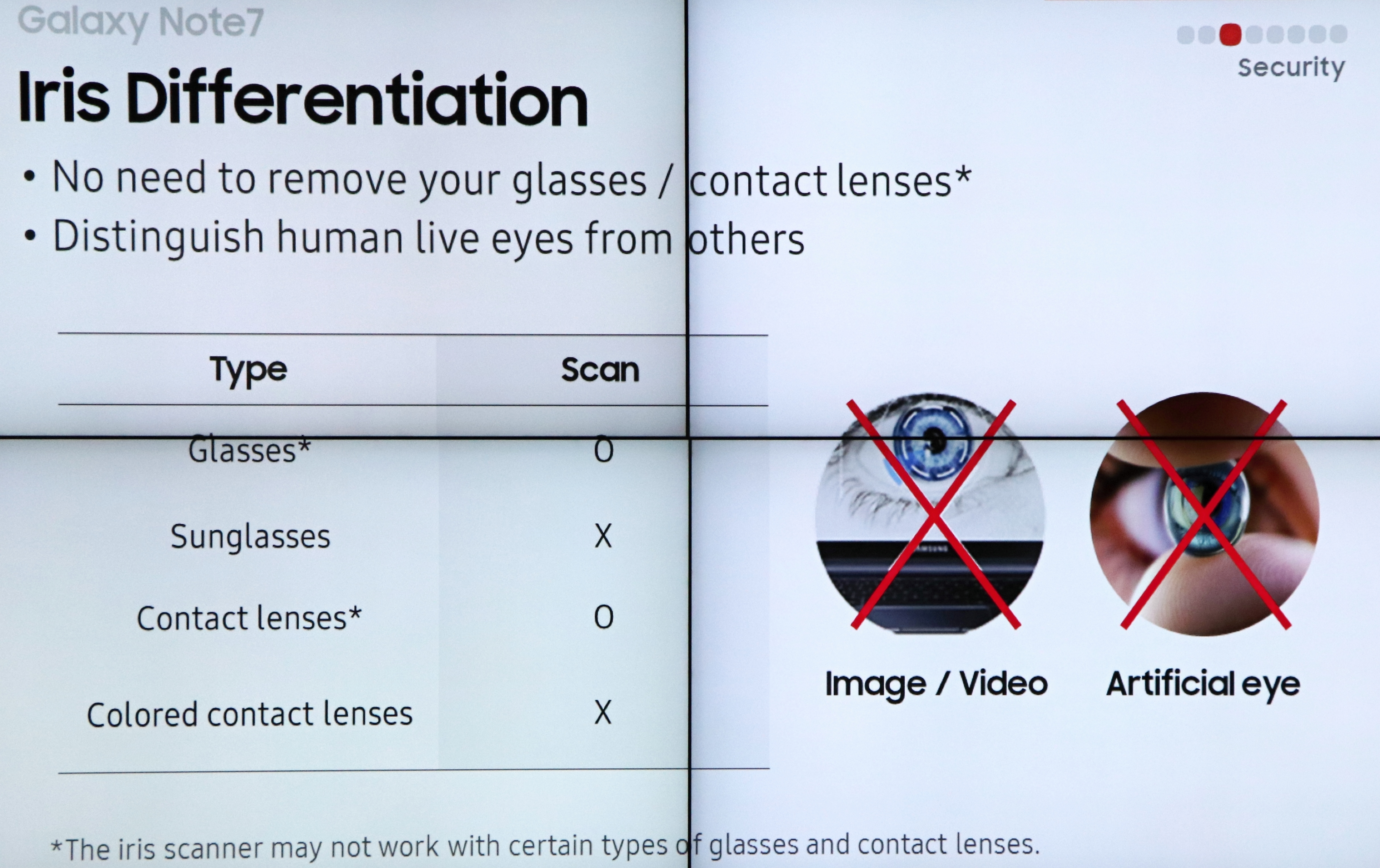 Snímanie dúhovky funguje aj s okuliarmi a väčšinou kontaktných šošoviek a nemalo by sa dať oklamať zosnímaním obrázku, či priestorového modelu oka