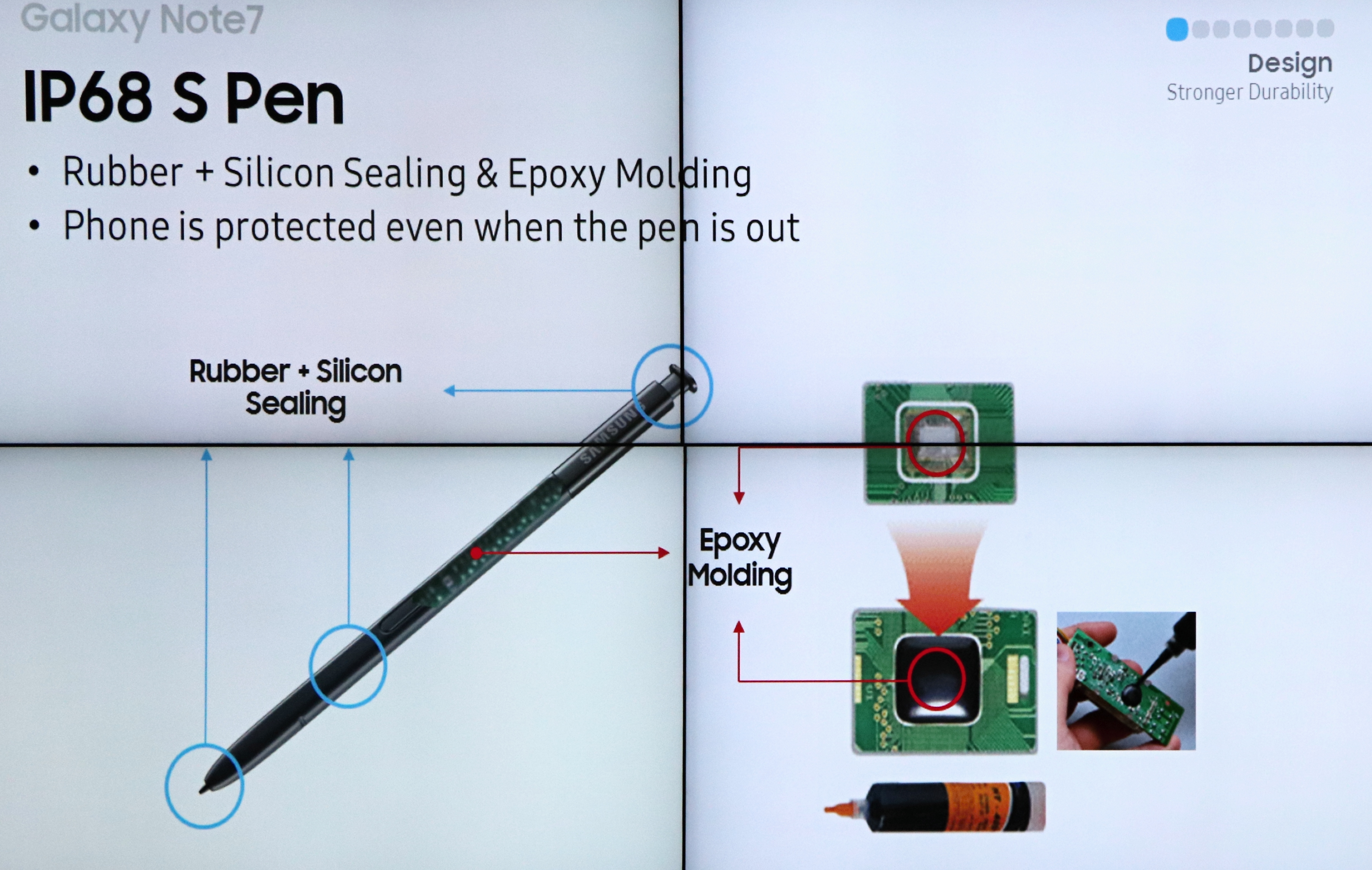 Elektronické pero je uložené v telese telefónu. Po vysunutí v móde zamknutého prístroja môžete písať poznámky priamo na obrazovku uzamknutia. Nakoľko táto funkcia je dostupná bez nutnosti odomknúť telefón a prihlásiť sa, bude sa využívať len na bežné poznámky, ktoré neobsahujú citlivé informácie. Po vysunutí pera v režime odomknutého telefónu sa zobrazia ikony funkcií, ktoré pero využívajú usporiadané prehľadne v polkruhu. Keďže Note7 je hlavne pre firemných používateľov, určite sa môžeme tešiť na aplikácie, ktoré v synergii so Samsung Cloudom umožnia zdieľanie rukopisom písaných poznámok a kresieb v reálnom čase. T
