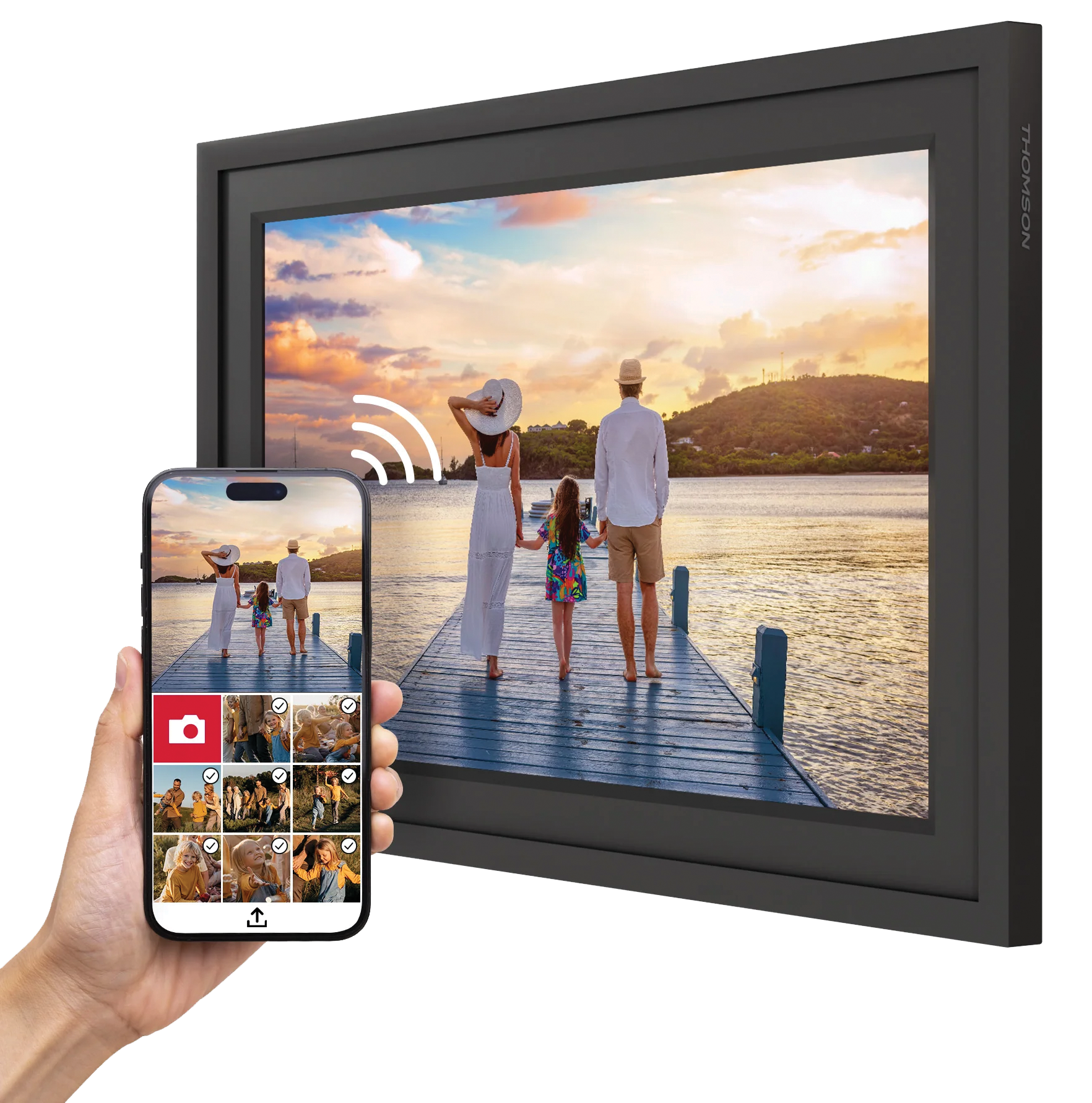 Digitálny rámček s dotykovou obrazovkou HD alebo FHD IPS zobrazujúcou videá alebo obrázky, informácie o počasí, čase, kalendári a prehrávaní hudby. Vychutnajte si plynulé prezentácie s 32 GB interným úložiskom a podporou externej SD karty s kapacitou až 256 GB. Vďaka bezplatnej aplikácii Thomson Smart Frame môžete vy a vaša rodina posielať obrázky a videá do rámčeka odkiaľkoľvek a kedykoľvek. Môže sa pripojiť viacero používateľov, čím sa rámček premení na živý album, do ktorého môže každý prispieť.
