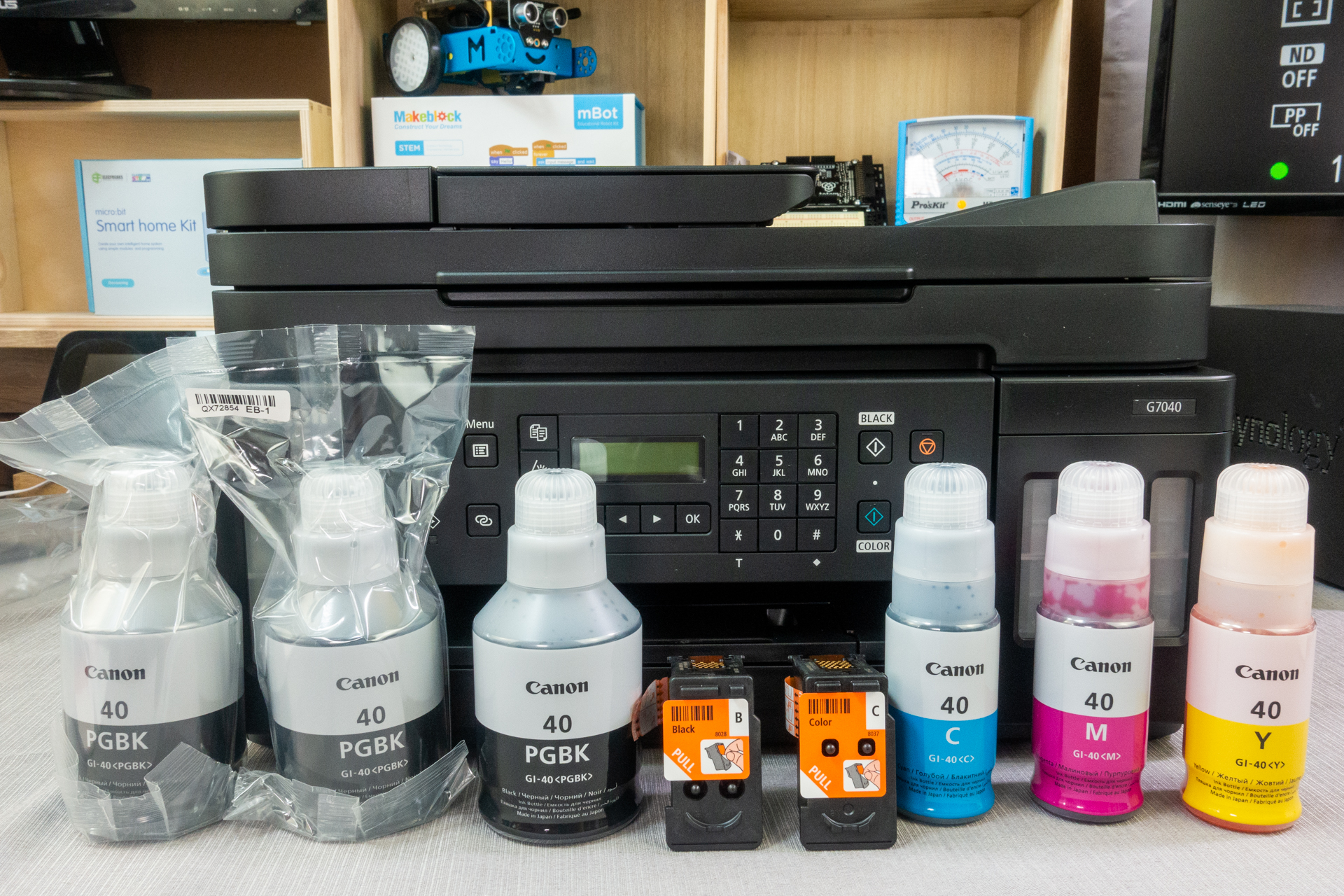 V balení nájdete tri plastové fľašky čierneho atramentu, každú z objemom 170 ml a súpravu farebných atramentov C (Cyan), M(Magenta) a Y (Yellow), každý s objemom 70 ml. Rovnaké objemy majú aj nádržky integrované v tlačiarni, takže stačí nasadiť fľašku na otvor v prázdnej nádržke a počkať, kým všetok atrament vytečie. Podľa výrobcu táto zásoba stačí na vytlačenie 18 000 čiernobielych strán, alebo 7 700 farebných strán. Samozrejme skutočná spotreba atramentu bude závisieť od toho, aká plocha papiera bude pokrytá.